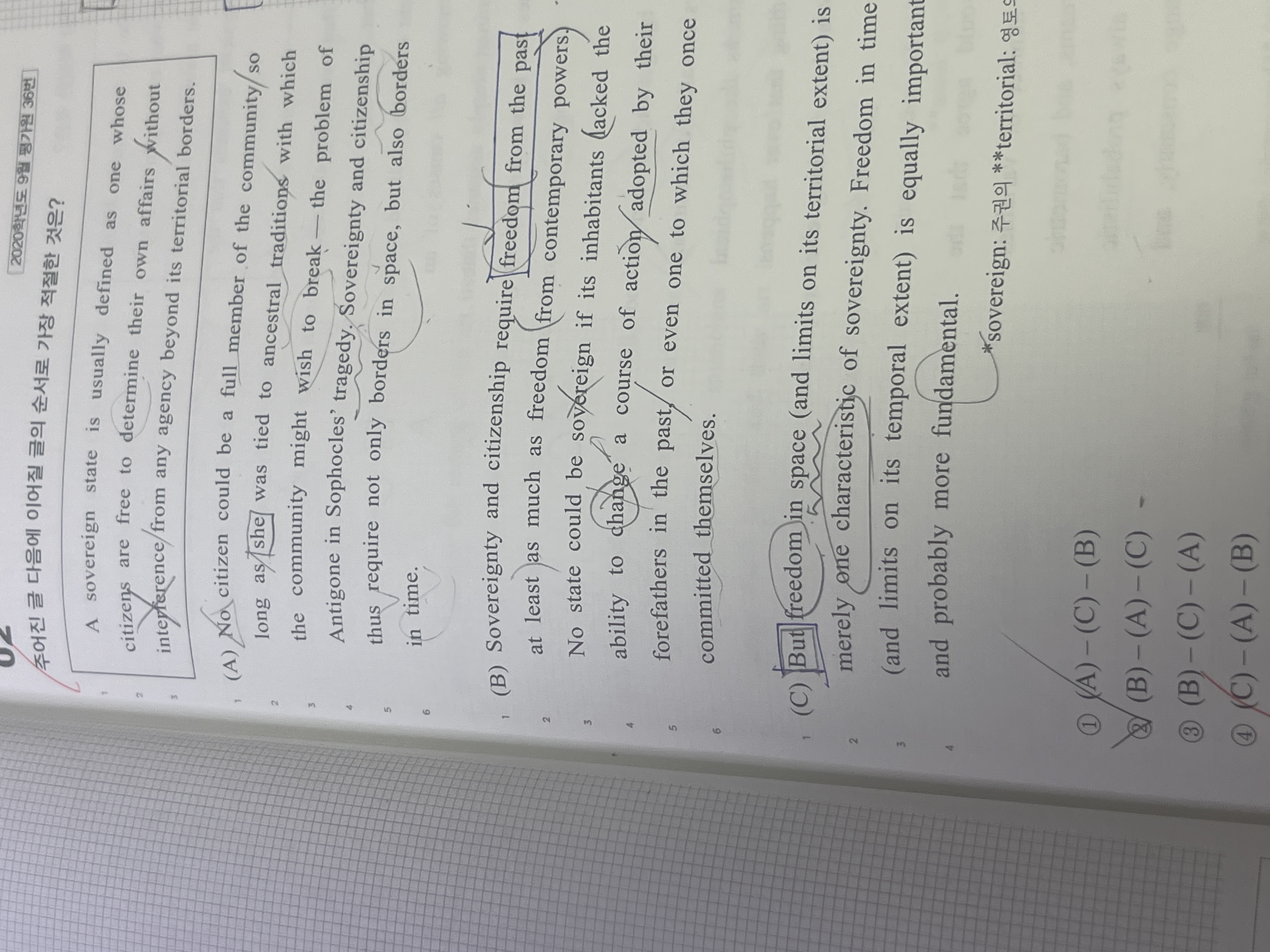 bac로 고른 이유는 C에서 역접이 잇고 공간적 자유가 one characteristic of sovereignty라그래서, 그 앞엔 A 맨 마지막 내용에서 공간적 경계와 시간적 경계 둘 다 필요하다는 내용이 흐름성이 좋다고 판단햇습니다 그렇게 AC를 묶고,, B는 네모박스랑 연결성이 좋아보여서 BAC로 선택햇습니다