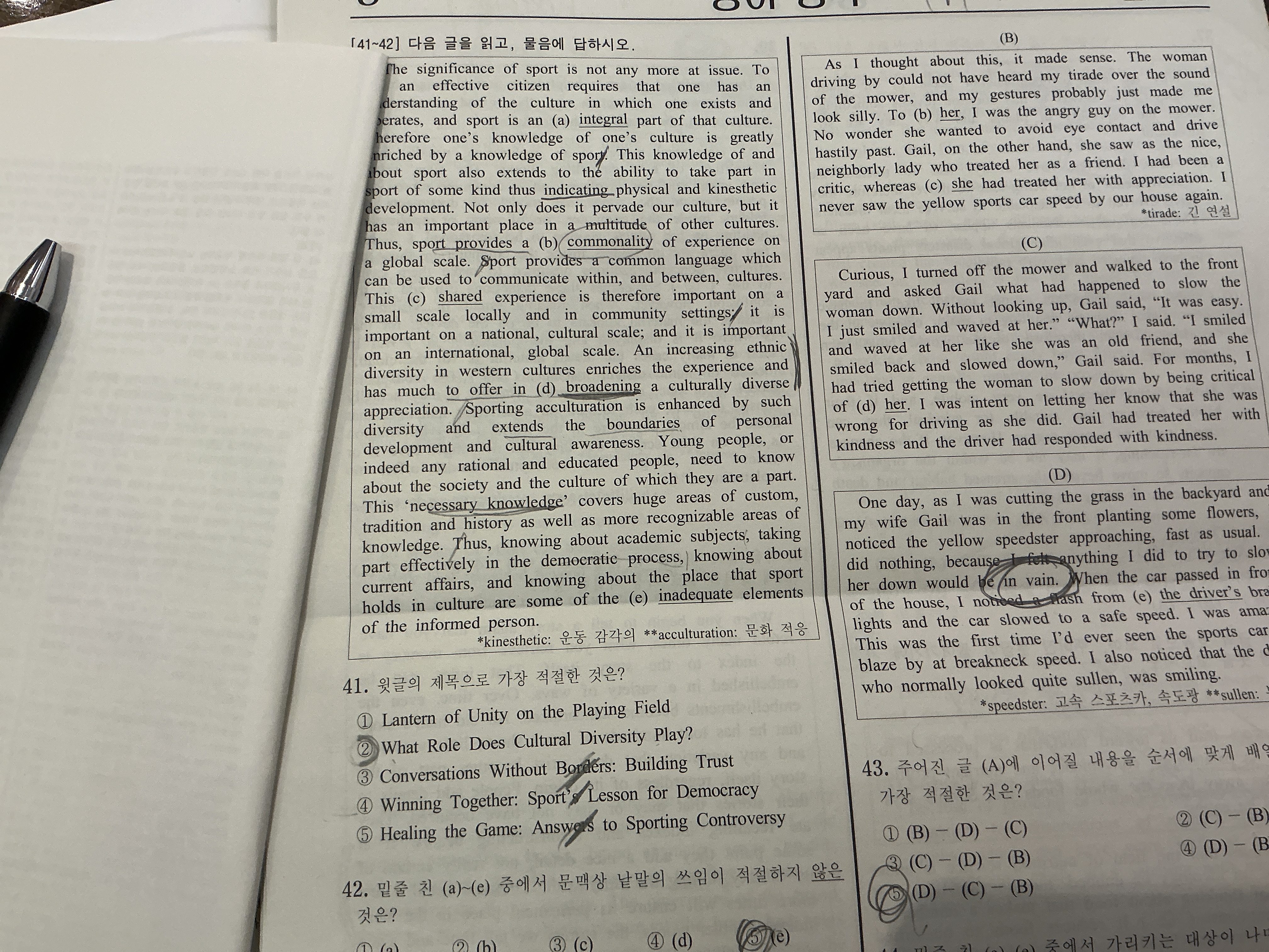 1. 지문을 읽고 나서, 선지에 ‘스포츠가 중요하다’ 와 ‘문화’에 대한 얘기가 있어야 되겠다 라고 잡았는데 일단 이건 잘 잡은게 맞나요?