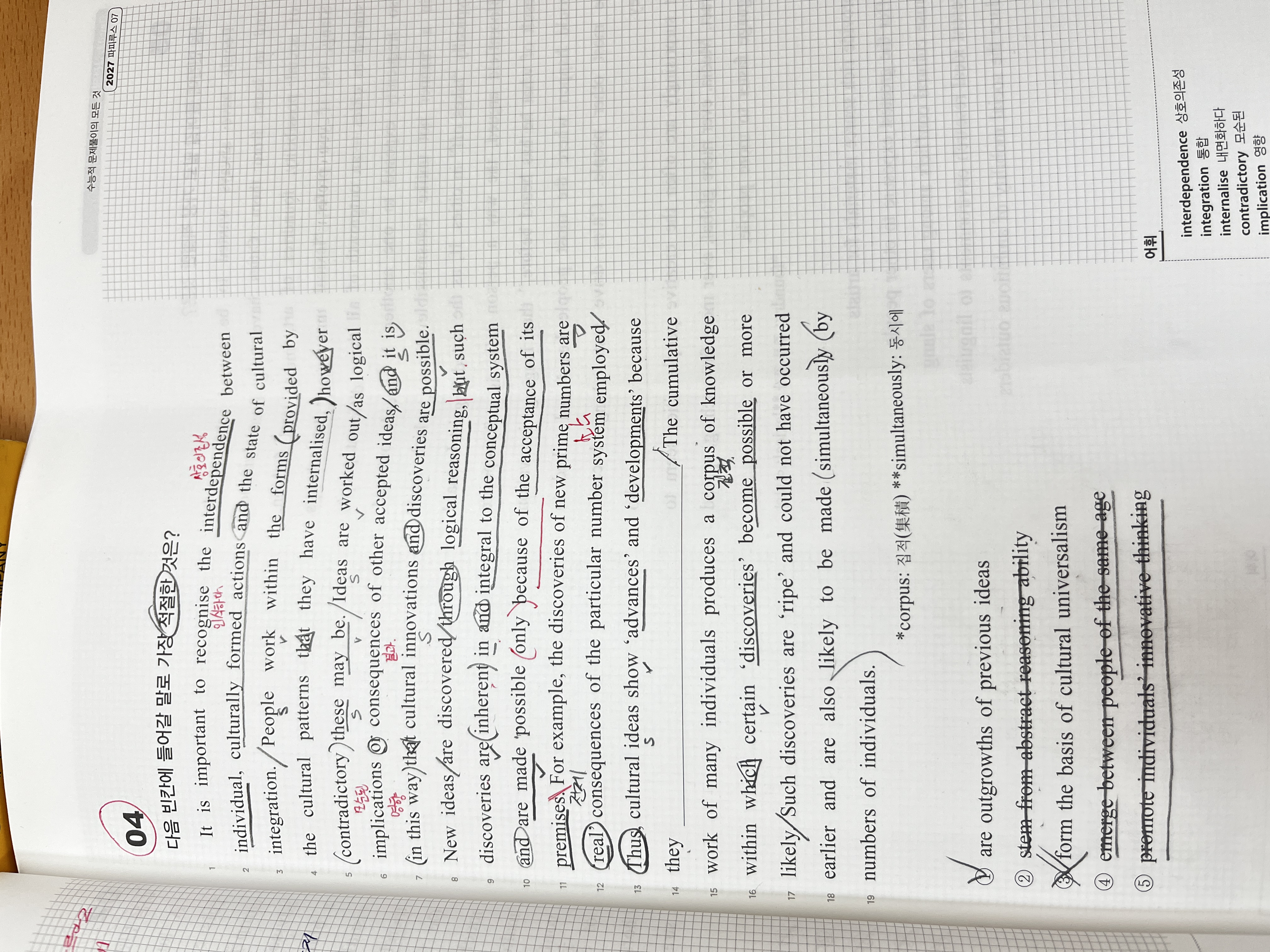 분석하다가 질문드렸습니다. 빈칸 전 문장까지느 해석이 잘 되는데 빈칸 문장 이후 2문장에 많은 개인의 축척된 작업은 특정 발견이 가능해지거나 가능성이 높아지는 지식을 생산산한다. 그러한 발견이 알맞게 익었(?) 고 더 일찍 발생하지 못하며며 다수에 개인에 의해 동시에 이루어질 가능성이 있다는 뜻이 내재된 사상이 새로운 사상의 혁신 발견에 영향을 미친다는 글에서 무슨 의미인지 잘 모르겠습니다. 설명해주시면
