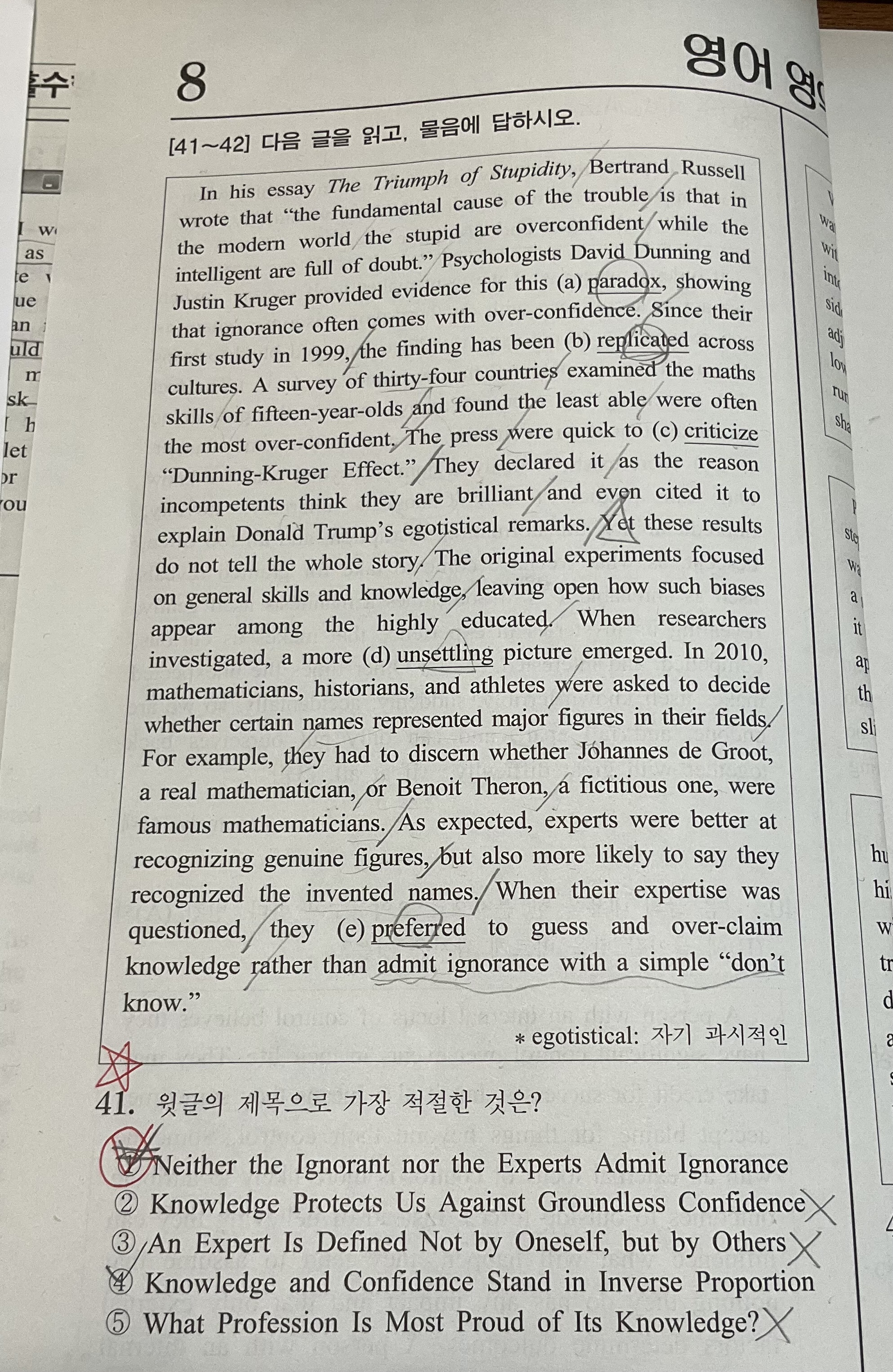 1번 선지는 ’무식한 사람들’이 ‘자신의 무지를 인정하는지 안하는지’에 대한 내용은 지문에서 보지 못해 정답에서 멀다고 생각했으며