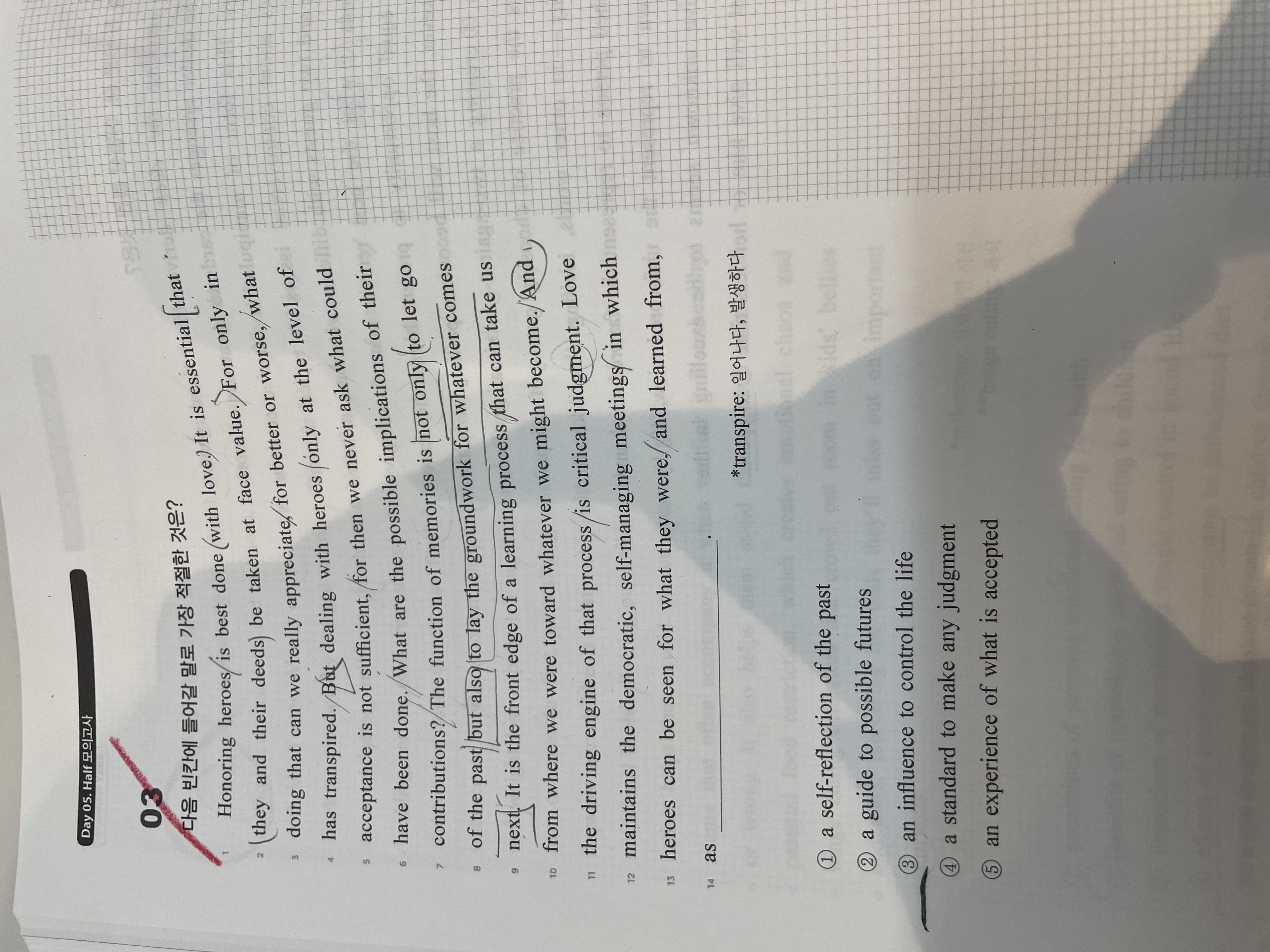 5회차 주간지 Day5 3번 문제입니다. 여기서 선생님께서 말씀하신대로 빈칸의 내용을 예측하며 읽어서 빈칸에 ‘어떠한 판단을 내리는데에 도움이 되는것’ 정도로 예측하였습니다. 답지에서는 ‘미래에 우리가 되어야 할 무엇인가에 대한 중요한 본보기가 될 수 있다’라는 내용이 전개되므로 유사한 내용이 들어간다고 하였습니다. 그러면 4번도 답으로 적절한 것이 아닌지 궁금합니다 4번은 어느 판단을 내릴 수 있는 기준인데, 우리가 되어야 할 무엇인가를 정하는 것이 판단이고, 영웅이 그 기준이 되는것 아닌가요?
