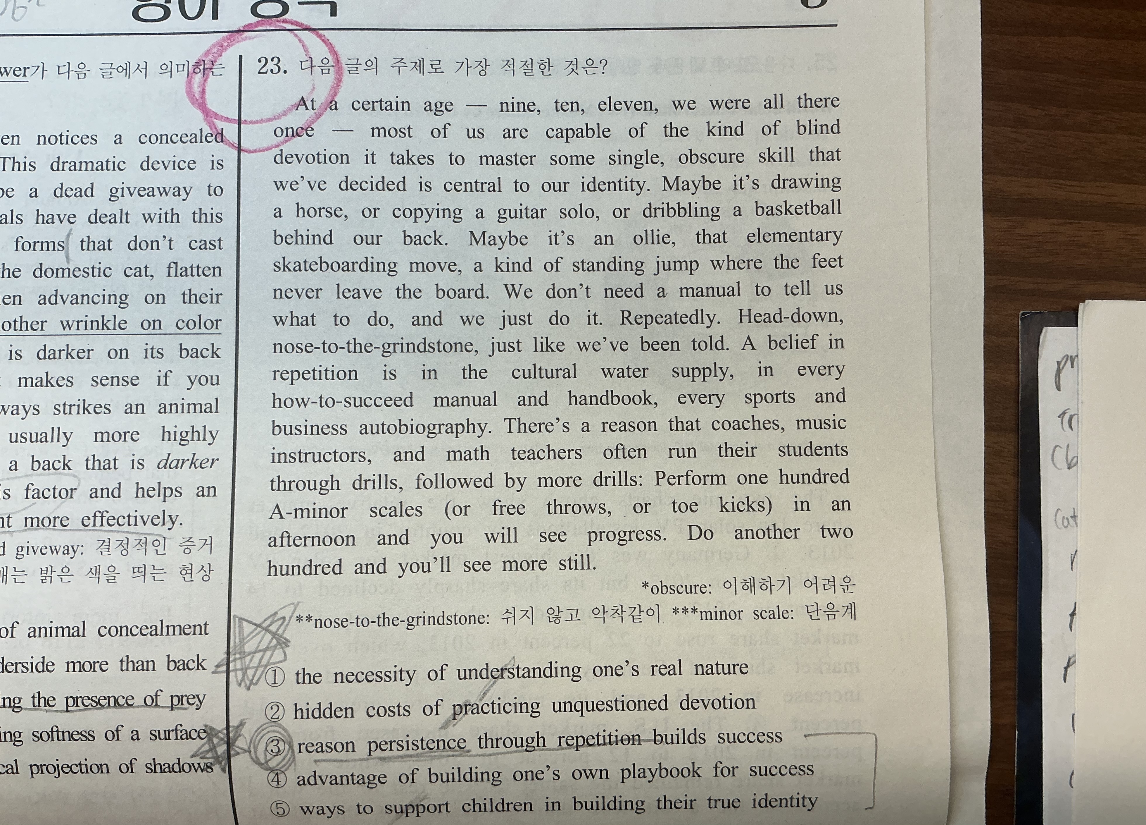 제가 생걱했을 땐 반복을 통한 끈기가 성공을 이끈다는 얘기만 나왔을 뿐, 그 이유에 대해선 지문에 안나온거 같았는데