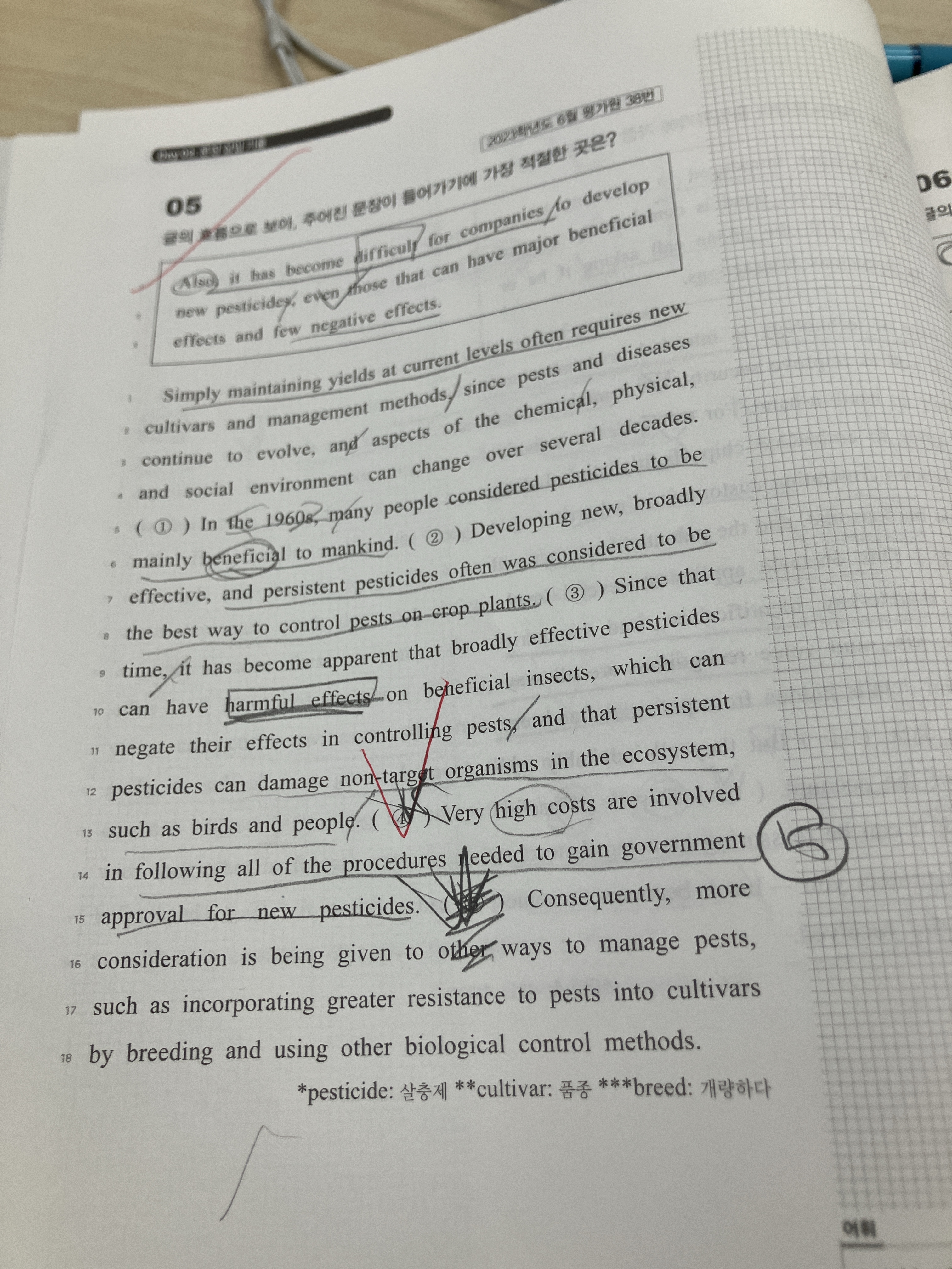 4번 문장에서 많은 돈이 든다 그리고 삽입문장으로 또한 회사들이 장점이 더 큰 살충제 까지 만들어야 해서 힘들다로 받아주는 느낌이 괜찮다고 생각해서 5번을 했는데 왜 5번이 안되는지가 잘 이해가 안됩니다