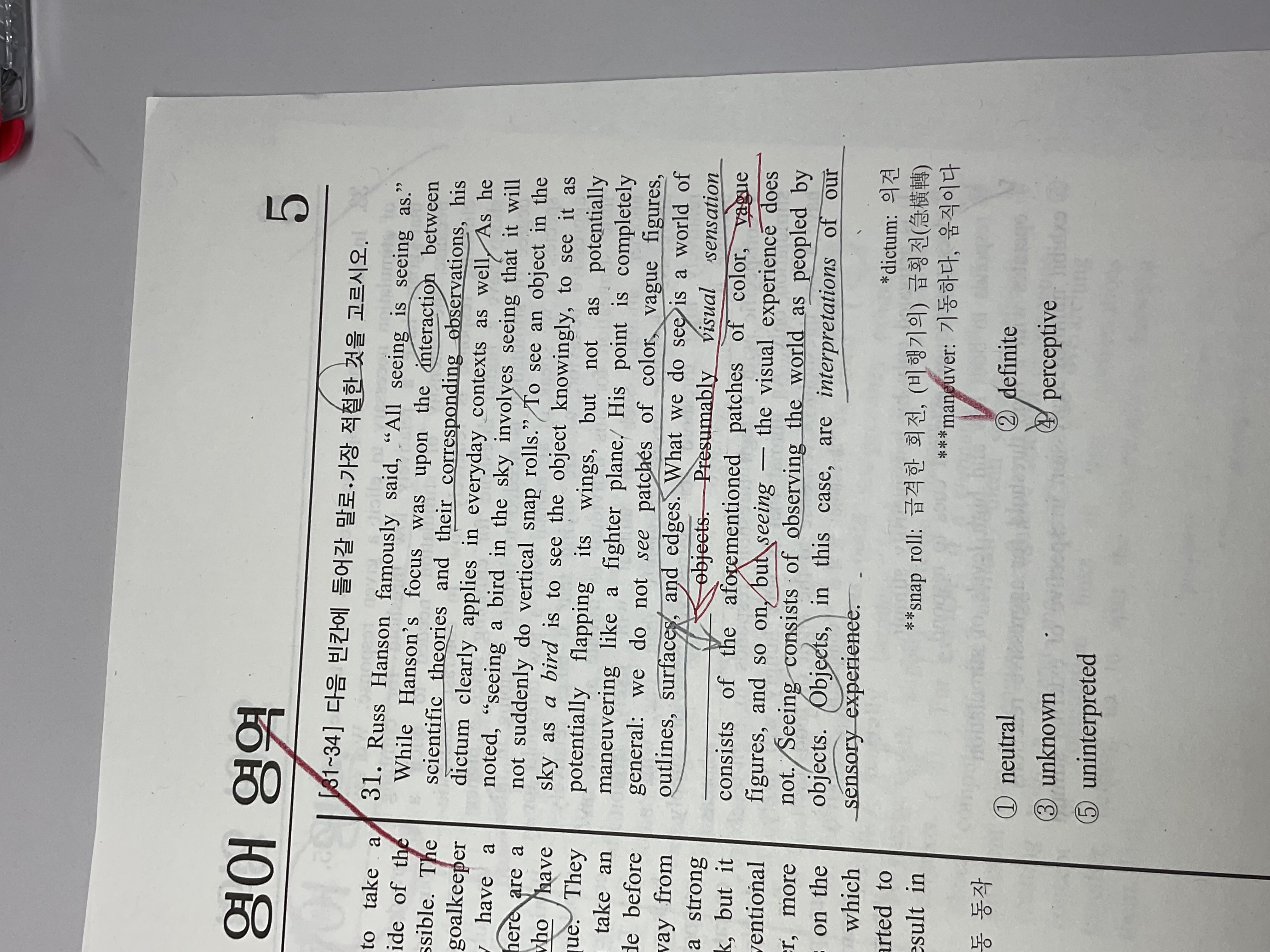 모호한 것의 반대라는 것을 근거로 자븡면 2번이 명확히 답이지만, 해설처럼 마지막 문장을 근거로 답을 골랐는데 틀렸습니다ㅠ ‘해석‘에 강조표시가 되어이쓰니 해석에ㅡ대한 키워드를 골라야하고 그 해석은 감각경험에 대한 해석이니 3번이라고 생각했습니다. 오히려 해석은 확정적인게 아니지않나요? 해설에선 감각경험에 의해 확정된 것이라고 봐야한다는데 그렇게 잡을 근거가 없다고ㅜ생각합니다ㅠ