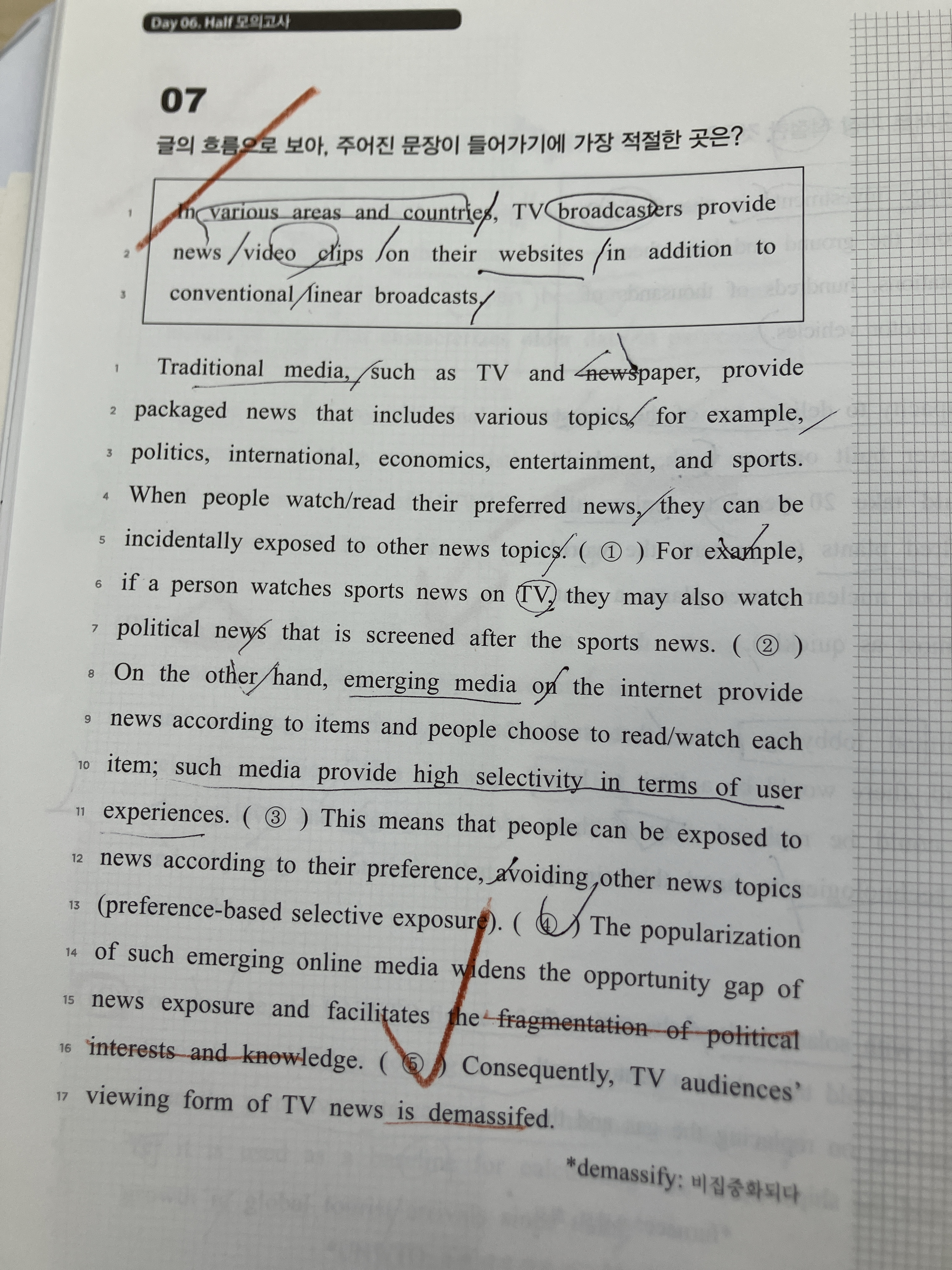 답이 5번이던데, 저는 저 5번에 주어진 문장이 안 들어가도 자연스러운 것 같습니다..!! (전 2번 선택했습니다)