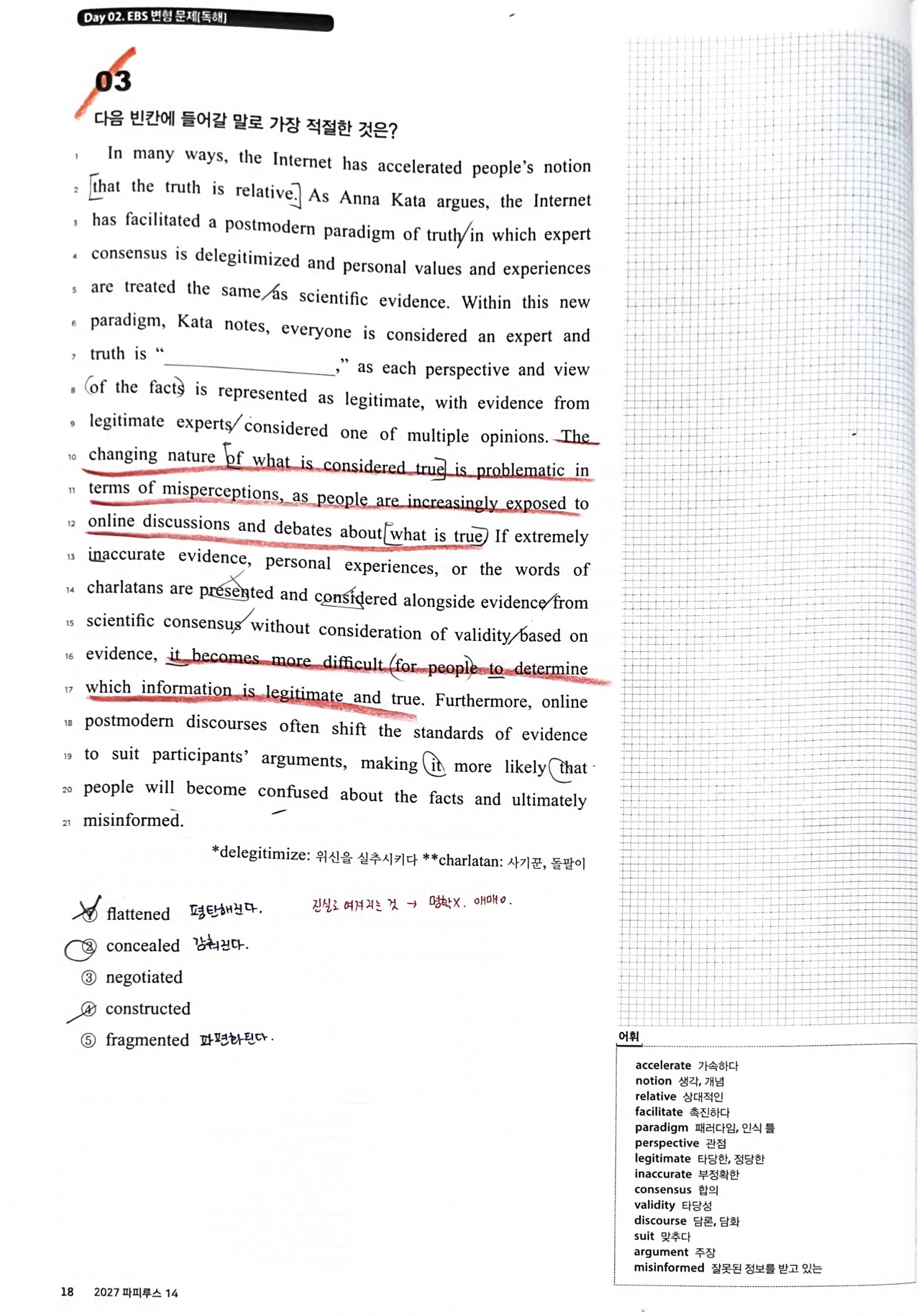 파피루스 14권 Daily Assignment Day2 3번문제(p.18)에서 답이 1번(flattend)이라고 하는데 왜 그런지 명확하게 이해가 잘 안돼요 ㅠㅠ 저는 처음에 5번(fragmented) 라고 생각했어요