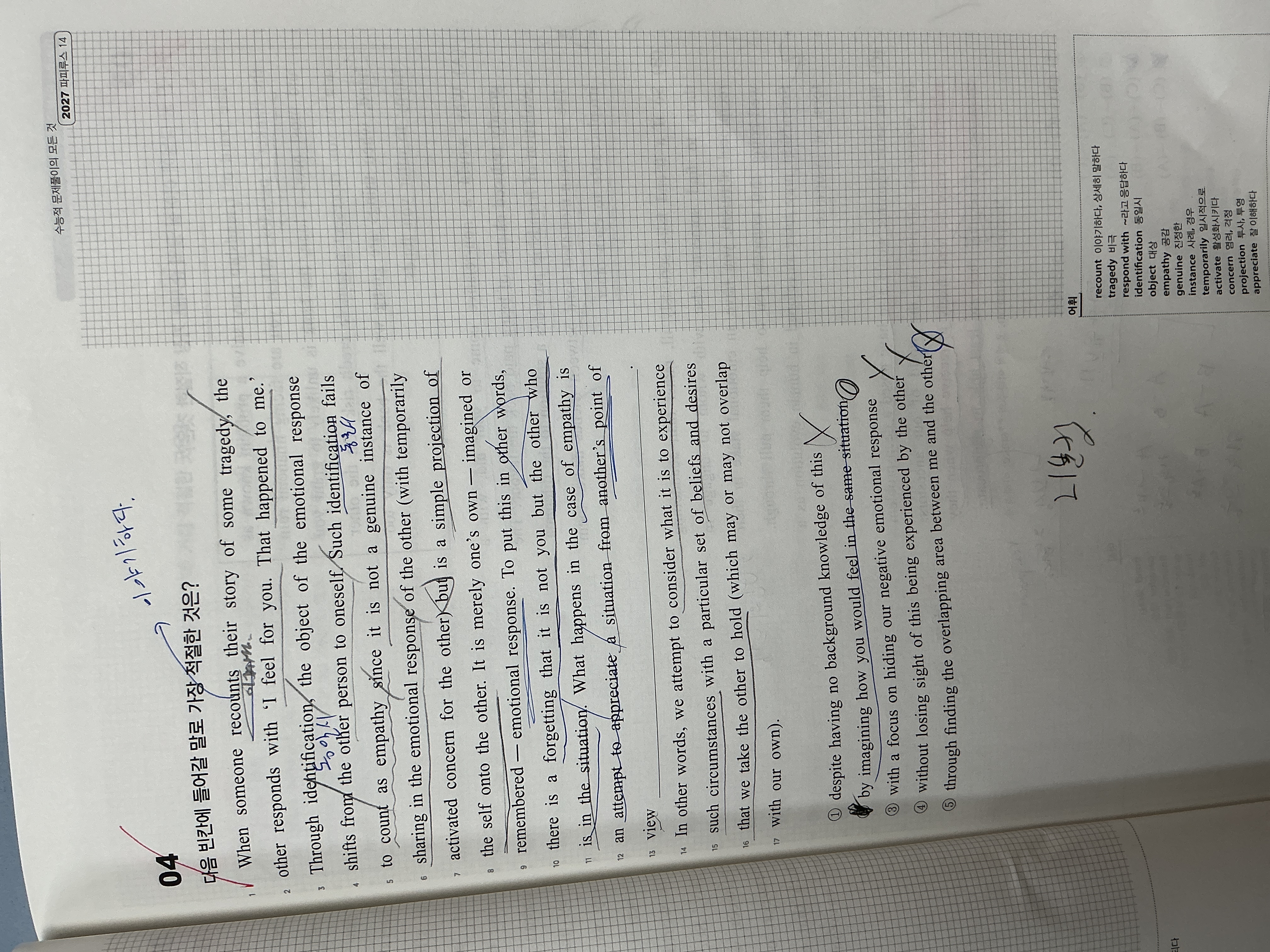 파피루스 14권 Day4에 4번 2번도 가능하지 않을까요? 공감이란 같은 상황에서 자신을 상상하는것이니까 주제와 맞지 않나요? 2번을 어떻게 지우는지 궁금합니다