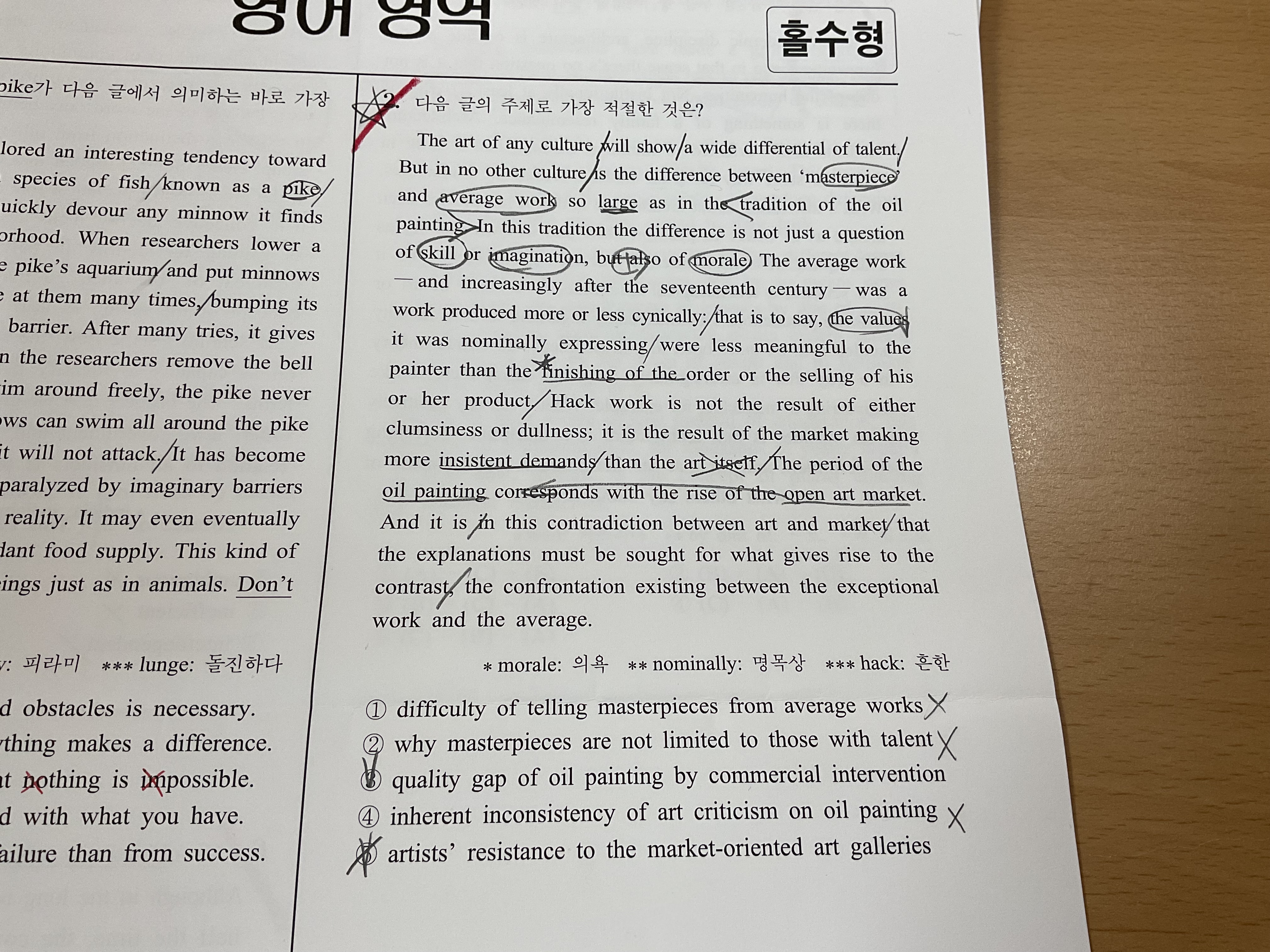 주제,제목 문제에서 선택지가 헷갈린다기 보다 이 문제처럼 내용이 잘 이해가 안되서 나중에 3,4번 읽어봐야 이해되는 문제는 시간이 없을때 어떻게 빨리 풀수 잇나요..??