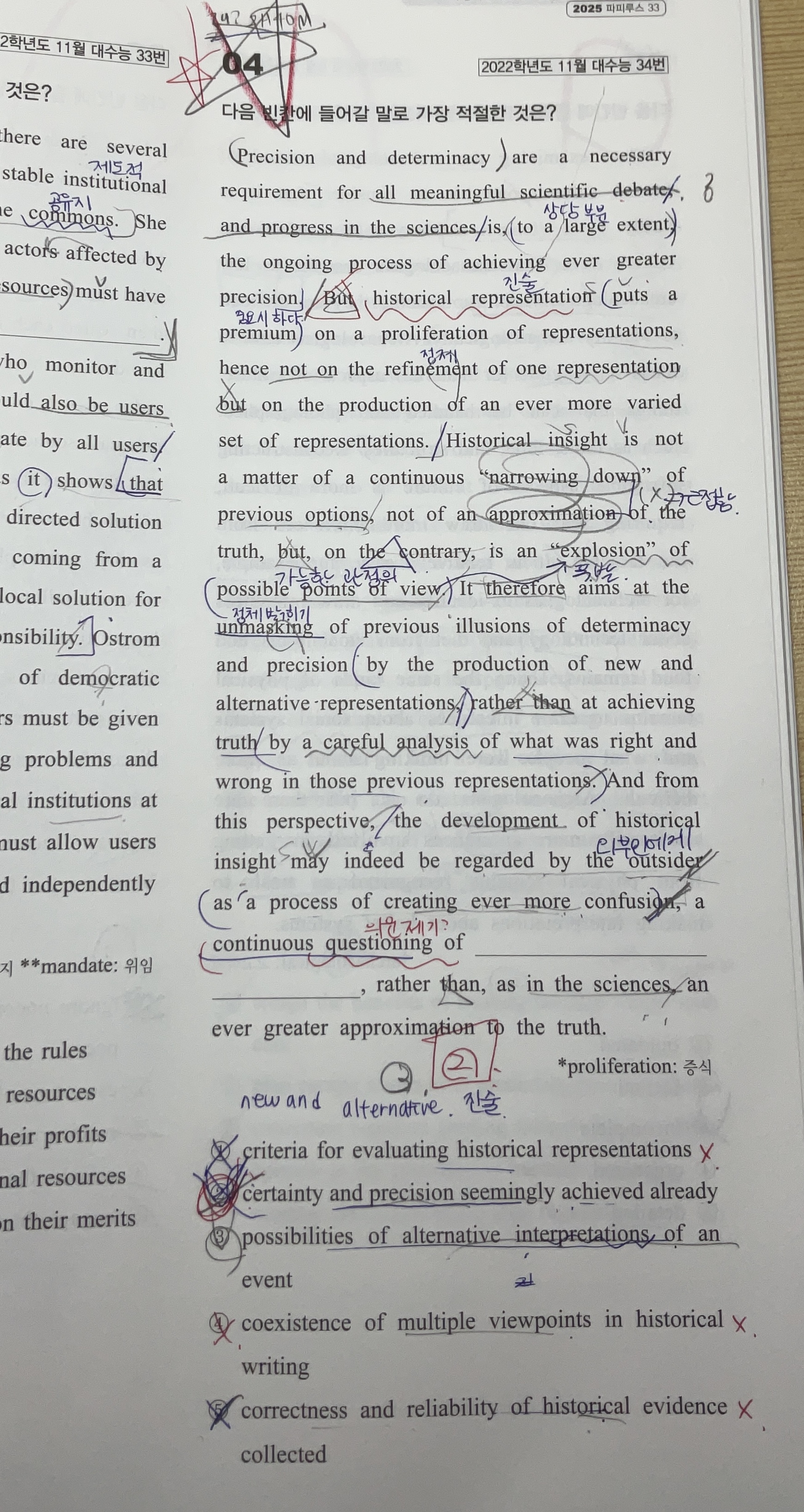 파피루스 33 데이3 4번문제에서 빈칸에 과학과 다른 역사적 해석의 특징이 들어가야 한다고 생각한 곳 까지는 갔는데요 왜 굳이 답이 2번이어야하는지 이해가 가지 않습니다... 3번도 충분히 답이 될 수 있지 않너요? 앞문장에 production of new and alternative representations라고 근거를 잡아보면 3번도 답아 될 수 있다고 생각하였습니다...!