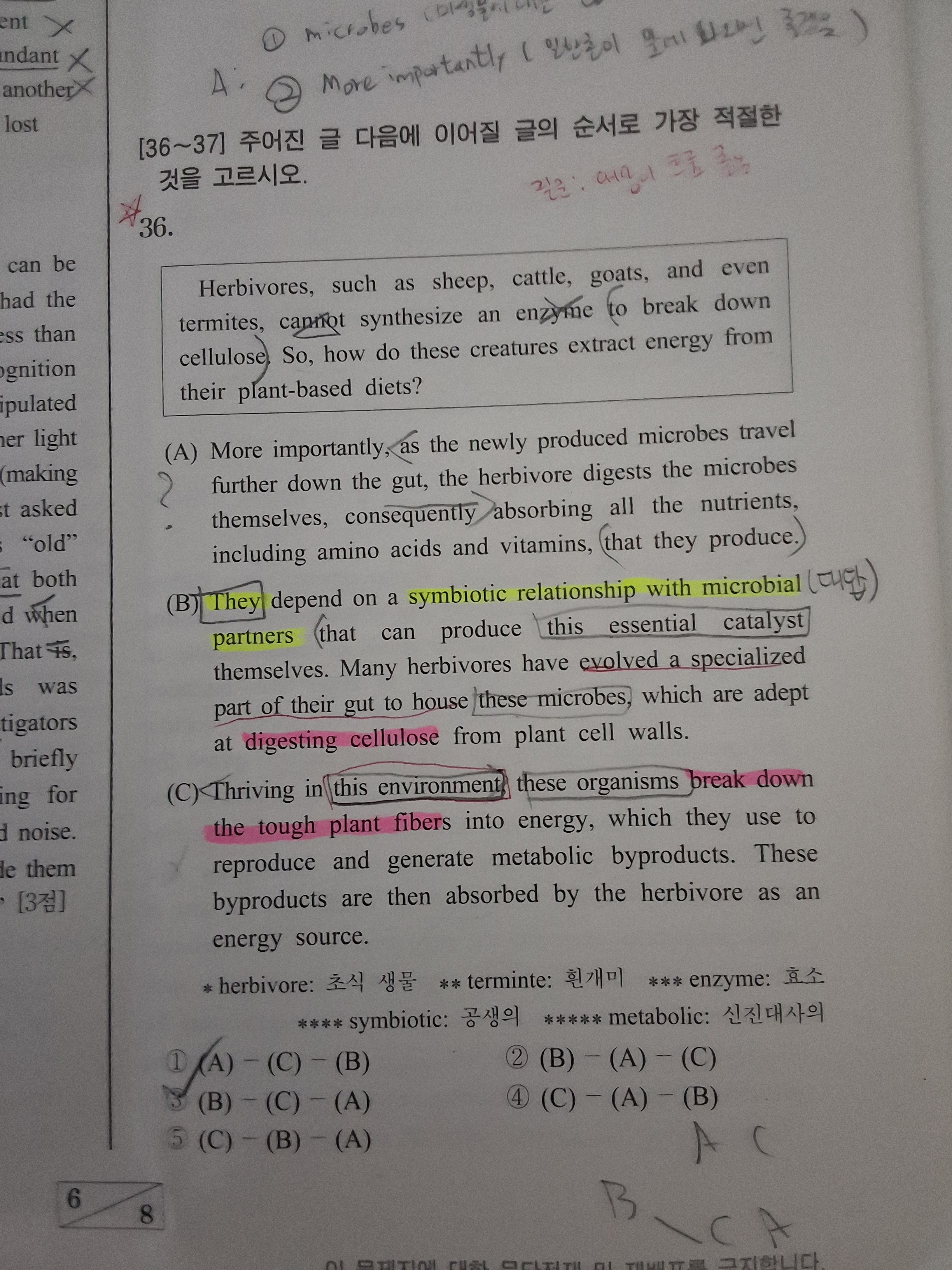 제 기억에는 삽입이 아닌 순서 문항의 경우 'this'나 'these'가 바로 앞 문장은 아니더라도 이 문제처럼 앞 '단락'에 있어도 괜찮은 경우가 많았던 것 같아서요... 즉, 이 문제의 경우 선생님께서 this를 the로 바꾸셔야 한다고 했는데, 그냥 this로 써도 무방하지 않나 합니다. 평가원 문제에서도 이런식으로 '바로 앞 문장'이 아니라 단락 기준으로 봤을 때 가리킬 수 있는 대상이 있다고 봐야 라는 경우가 제법 있던 걸로 기억해서요.
