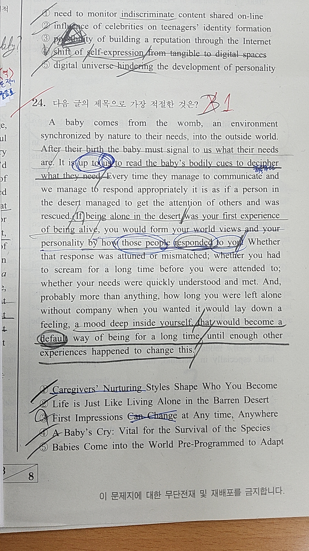 대전 금요일반 수강생입니다. 24번의 1번 보기 앞부분의 Caregiver's Nurturing을 지문에서 찾을 수 있는 근거가 있을까요? 나머지가 너무 아니어서 답이 1번인 이유는 알겠는데, 보호자의 양육과 관련된 얘기는 지문에서 찾기 힘들어서 질문합니다.