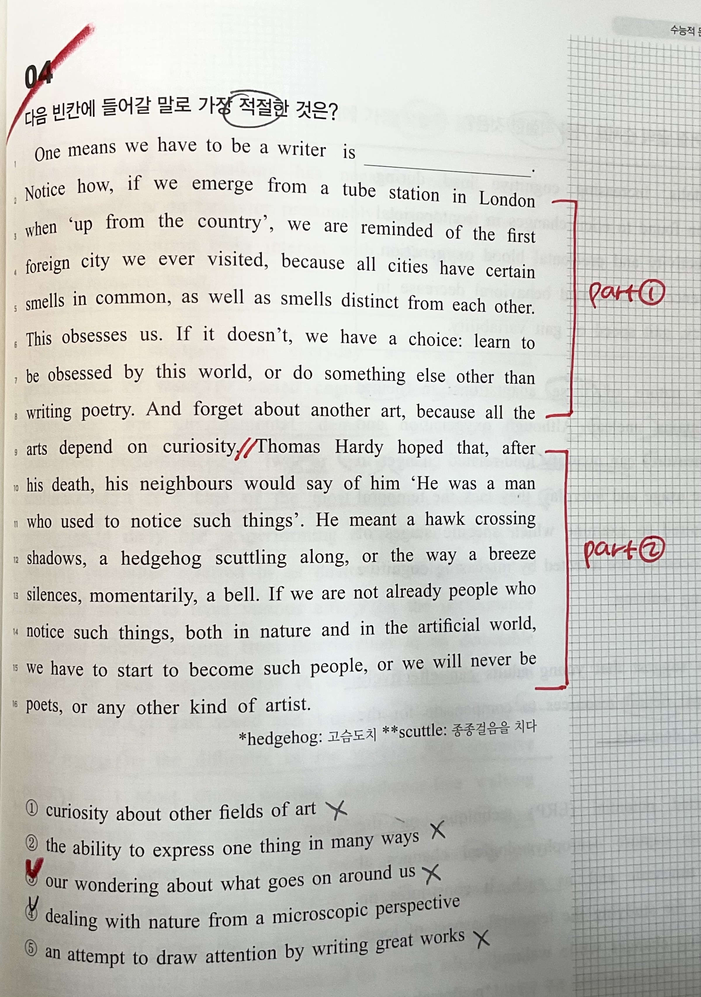 제가 문제에 표시한 것들 중 part1이 뭘 이야기하고 있는지 모르겠어요ㅠㅠ 첫 부분 이해를 못해서 두 번째 파트에 해당하는 4번을 정답으로 했는데 정답이 3번이라 두 가지 예시에서 답이 3번이라는 걸 도출해낼 수 있는 곳을 알려주세요ㅜㅠ