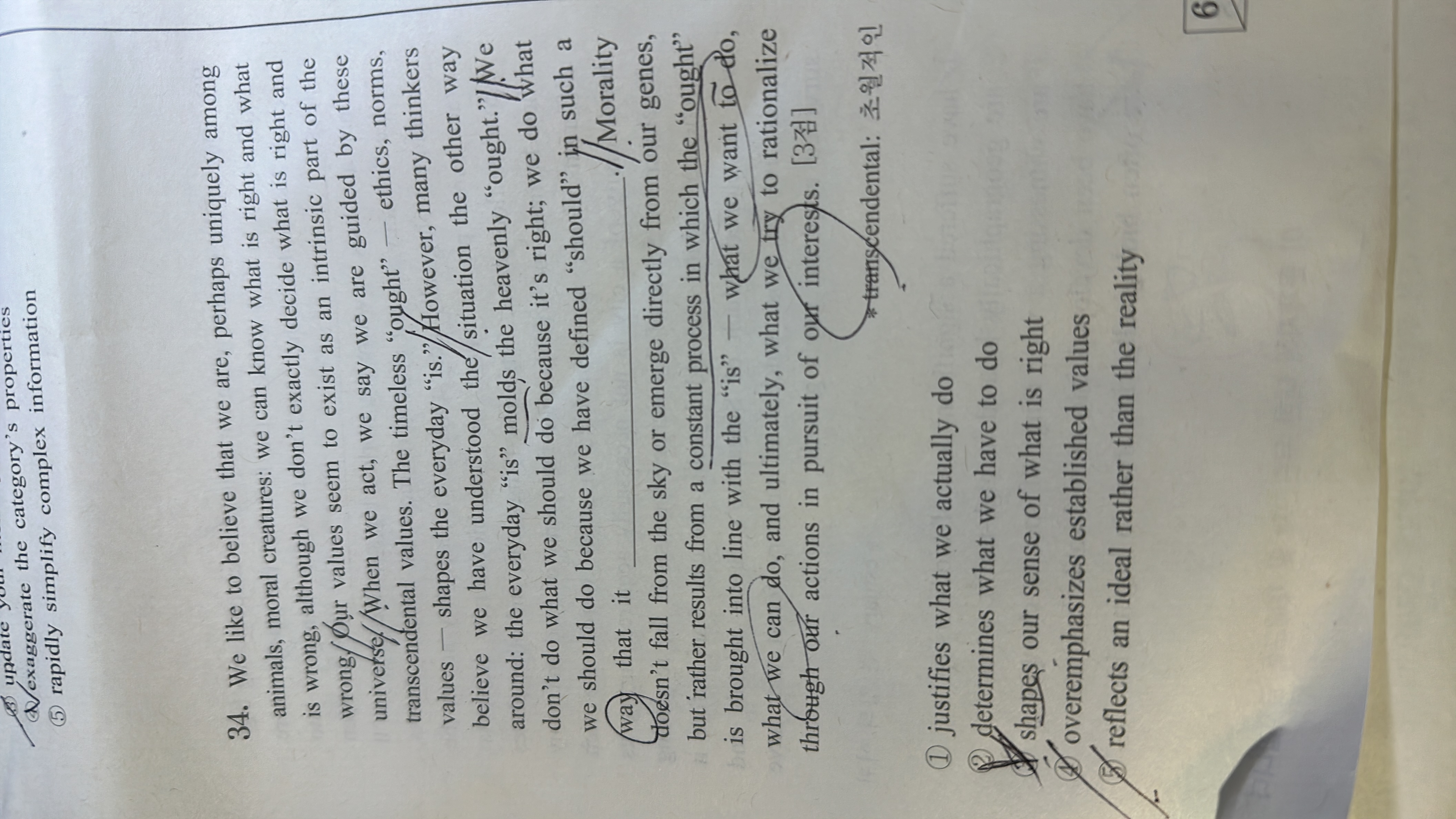 1,2,3번 다 들어갈수있는 말인데 그러한 방법은 자신이 해야한다고 결정한 그런게 빈칸에 들어가야하는데 1,2,3 다 똑같은 말 아닌가요? 선지에서 쓴 단어가 너무 무리가있는 그런단어도 없는게 3번에 올바른것에대한 감각 이것도 본문에 있는단어고 그리고 올바른기준은 하늘에서 떨어지는게아니라 자기자신이 선택한다고 본문에 있고 1,2번에대한것도 본문에 나와있어서 되는말 같은데 정당화한다 내가한행동을 / 결정한다 내가해야하는것