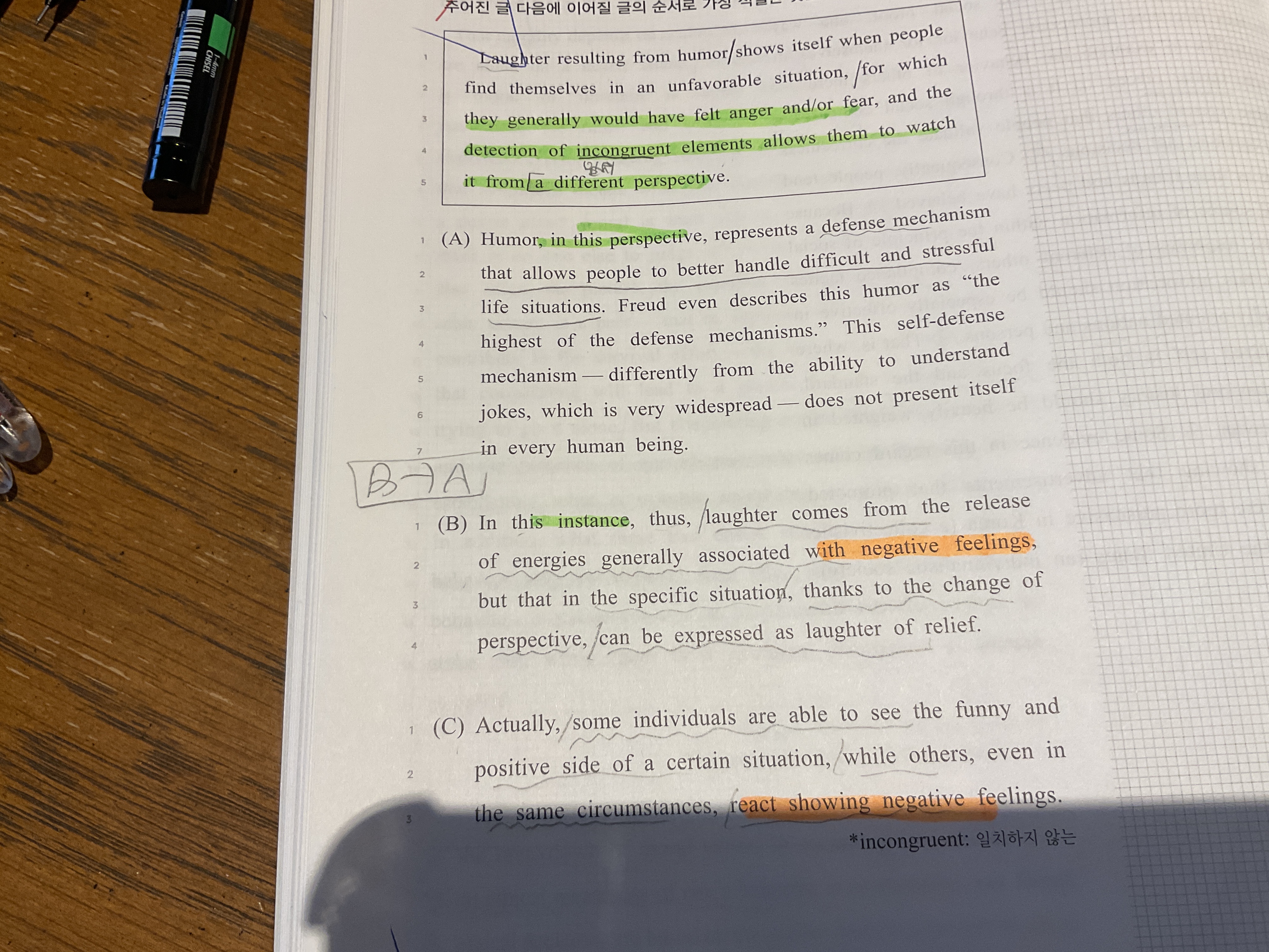 A의 this perspective 와 B 마지막문장의 thanks to the change of perspective 의 내용이 어울려 b-a는 일단 골랐습니다. 그다음 B의 this instance 문장을 보고 부정적 감정과 연결된 예를 찾아보니 C의 문장과 겹쳐 C-B-A 로 골랐습니다 내용상 주어진 문장을 읽고 마지막 different perspective로 볼 수 있다고 하길래 c의 앞문장 몇몇 사람들은 재밌게 보고 긍정적으로 보는데 다른 사람들은 부정적으로 본다고 하길래 different perspective 가 오는게 좋은 흐름이라고 생각했는데 어느 부분이 잘못되었나요