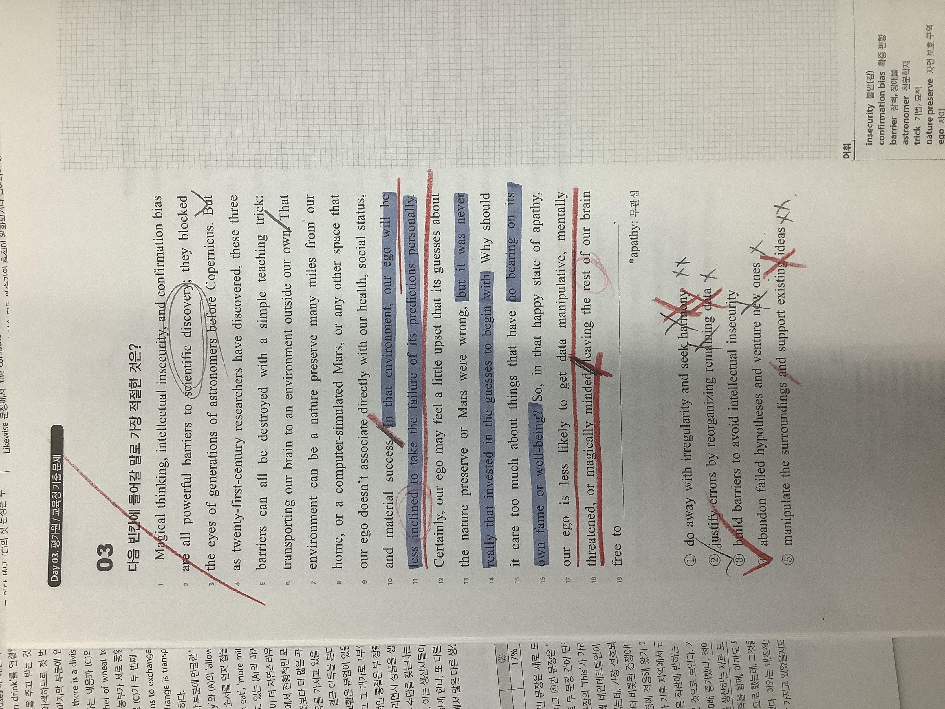 2. 저는 이 지문에서 형광펜 친 부분이 전혀 이해가 되지 않아 ‘뇌를 자신 밖의 환경으로 이동시킨다.’는 것만 이해했을 뿐, ‘이러한 환경에서 크게 연연하지 않을 수 있다.’는 내용은 파악하지 못했습니다.
