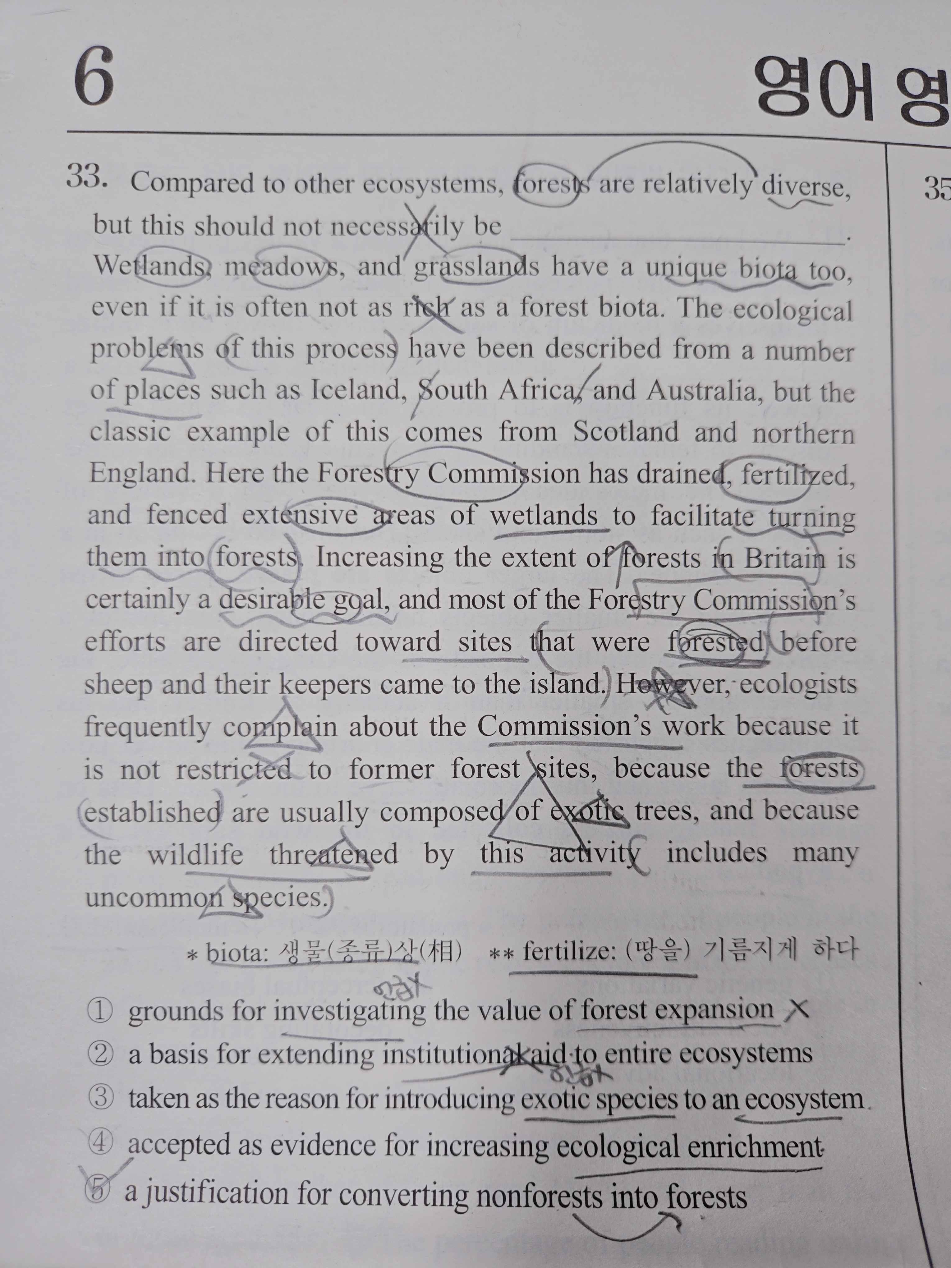 4번선지가 정답이 아닌 이유가 헷갈려요 숲은 생태학적인 풍부함이 증가하는 증거로써 받아들여지지 않는다에서