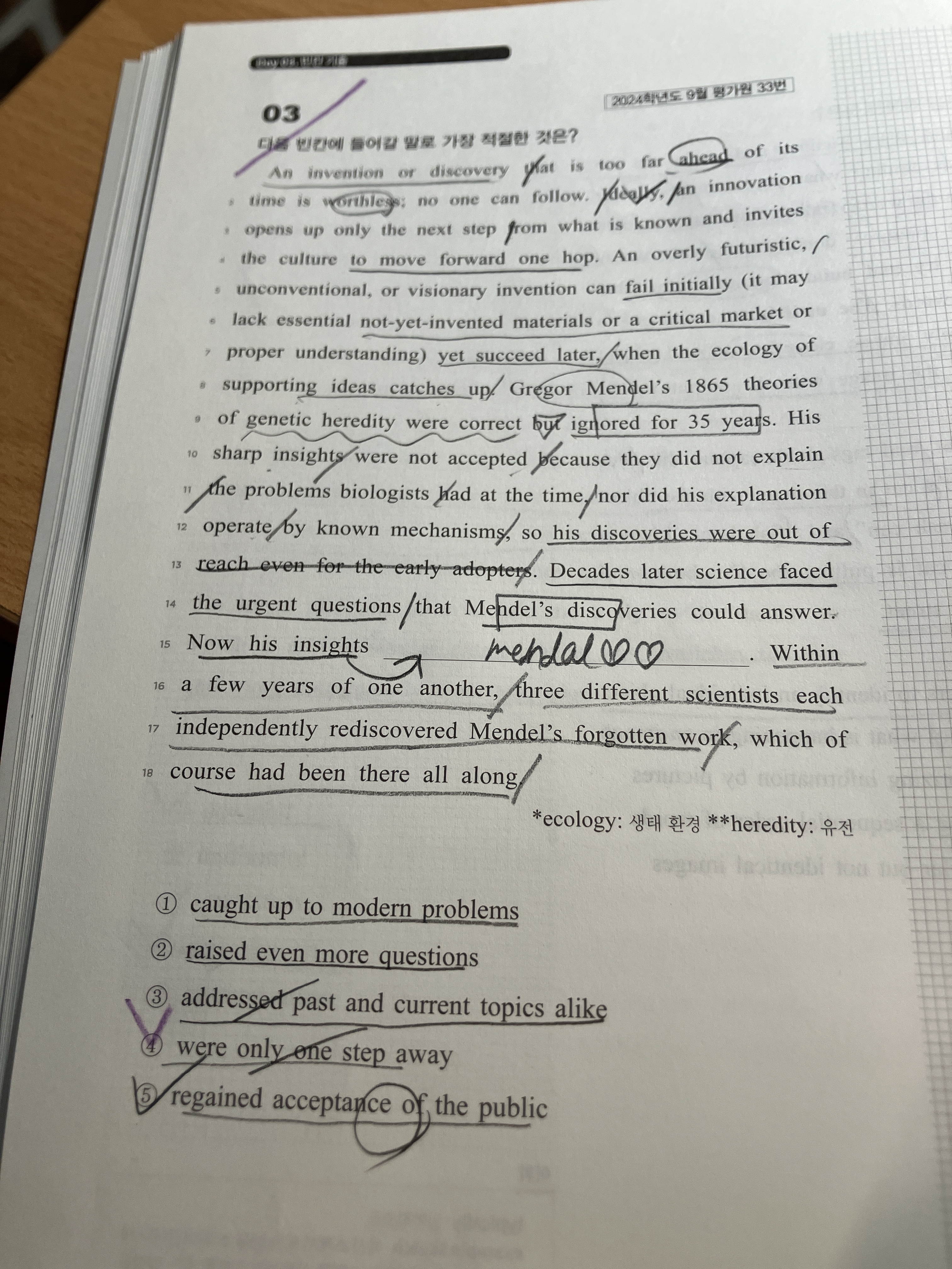 현재 그의 통찰력은~~~ 이니까 빈칸에는 현재의 멘델의 연구에 대한 평가? 비슷한 내용이 들어가야 한다고 생각해서 밑에랑 위에 보면 이제 과학자들이 멘델의 실험에 대해 더 연구하고 받아들인다고 생각해서 5번을 찍었는데 왜 4번이 답인지 이해가 잘 안됩니다ㅠㅠ