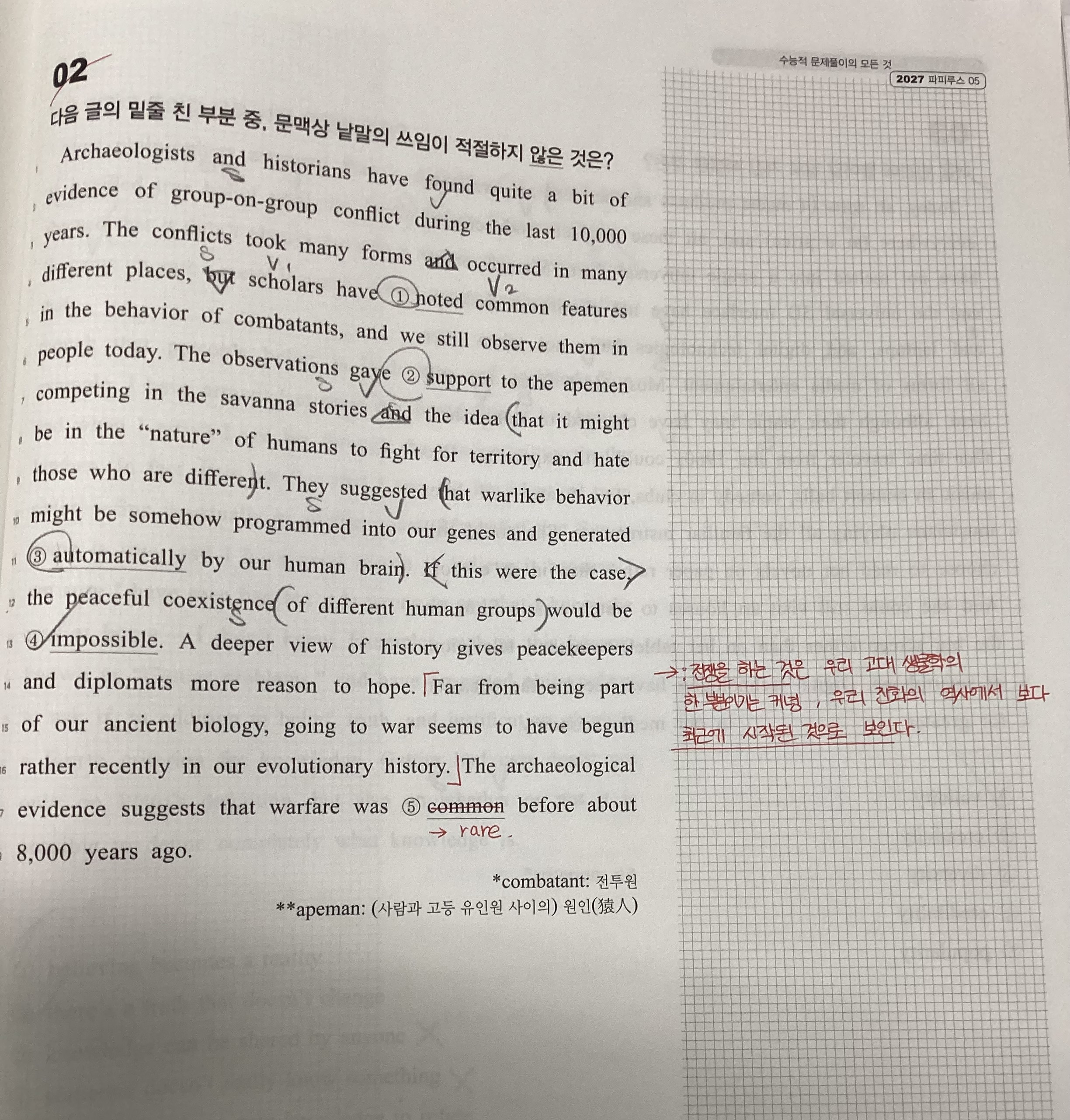 앞의 문장들은 다 과거부터 다툼이 있었으며 평화로운 공존은 불가능 했었을 것이라는 내용이고, ‘Far from being~evolutionary history.’ 문장은 전쟁이 최근에 시작된 것으로 보인다하는 내용이잖아요. 해석본은 ‘ 전쟁을 하는 것은 우리 고대 생물학의 한 부분이기는 커녕~‘ 인데 여기서 “커녕“이 부분 때문에 내용이 반전이 된 건가요?