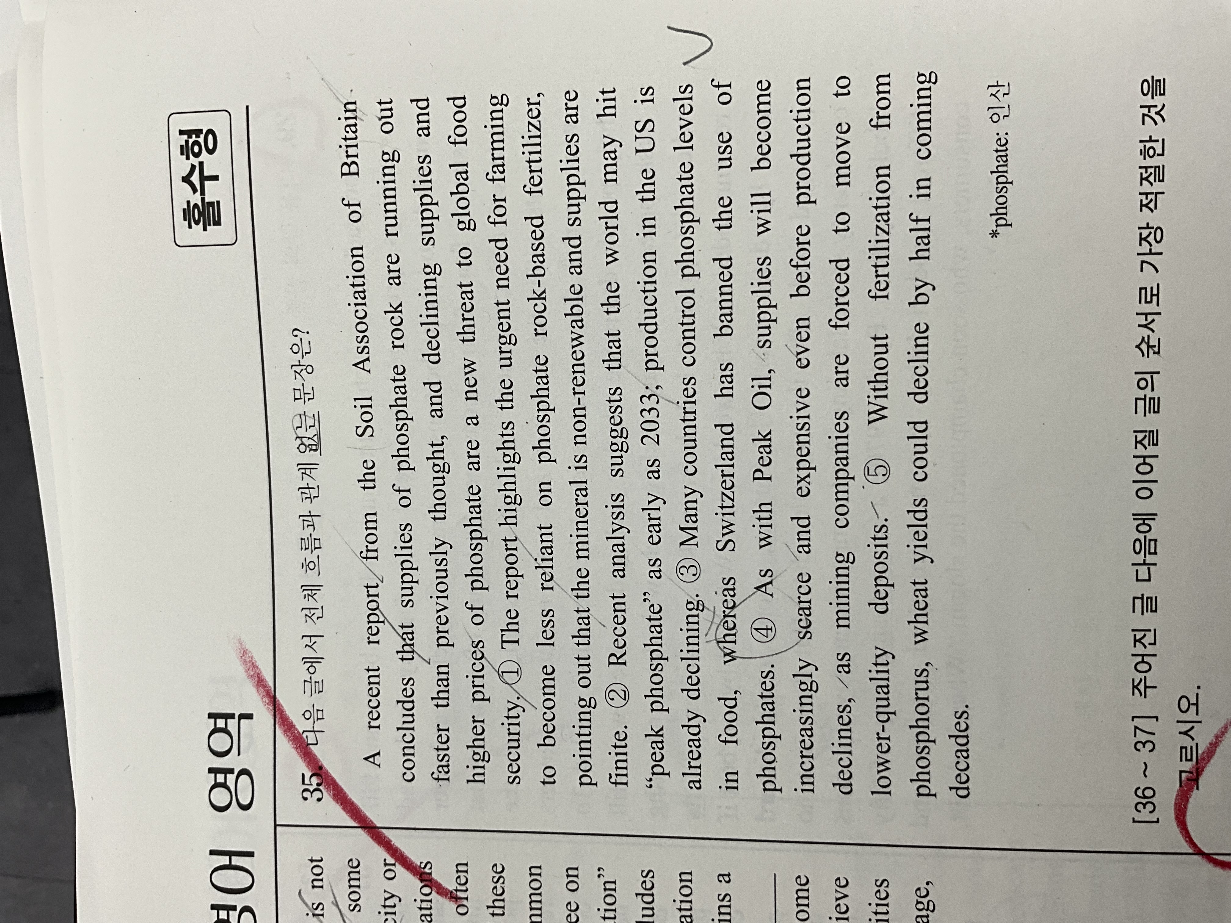 인산, 비료에 관한 부분을 서술하고 있었고 3번선지또한 2번에서 미국의 생산이 감소한다 라고 한거에 이어서 3번에서 많은 국가들은 규제하고 있는 반면, 스위스는 (심지어) 금지시키기까자 하였다. 라고 하고 4번에서 갑자기 기름얘기하다가 5번에서 다시 비료얘기하고 잇어서 4번이라 했는데 제 생각에서 자의적으로 해석한 (심지어) 이부분 때뭌에 잘못된 논리를 제가 펼친걸까요?