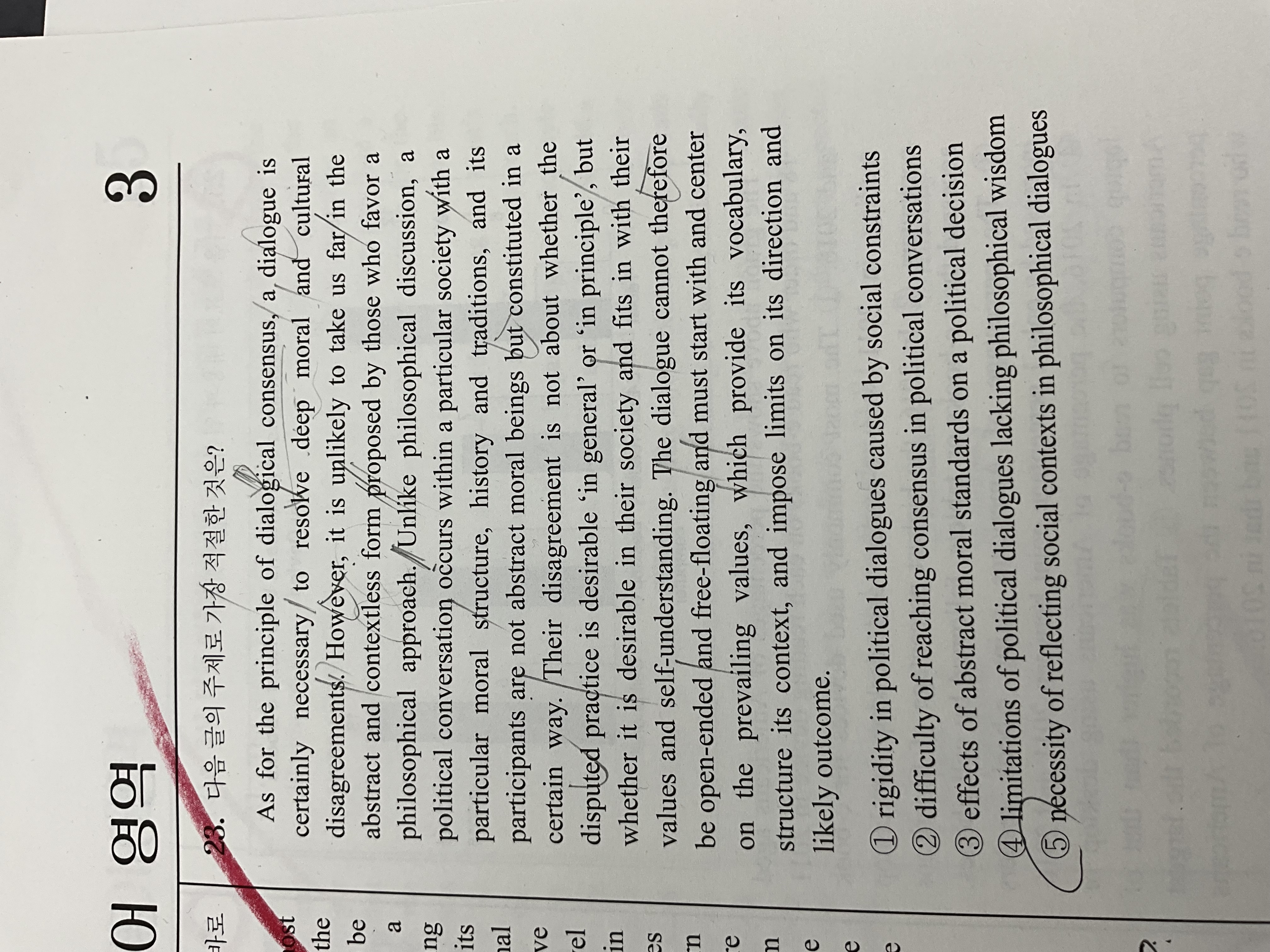 5번이 틀린이유는 in 전까지는 맞는데 정작 설명대상이 철학적우로 되어이잇어서 틀린 걱 맞나요? 즉 in political conversation이라고 하면 괜찮은 선지였읆까요?