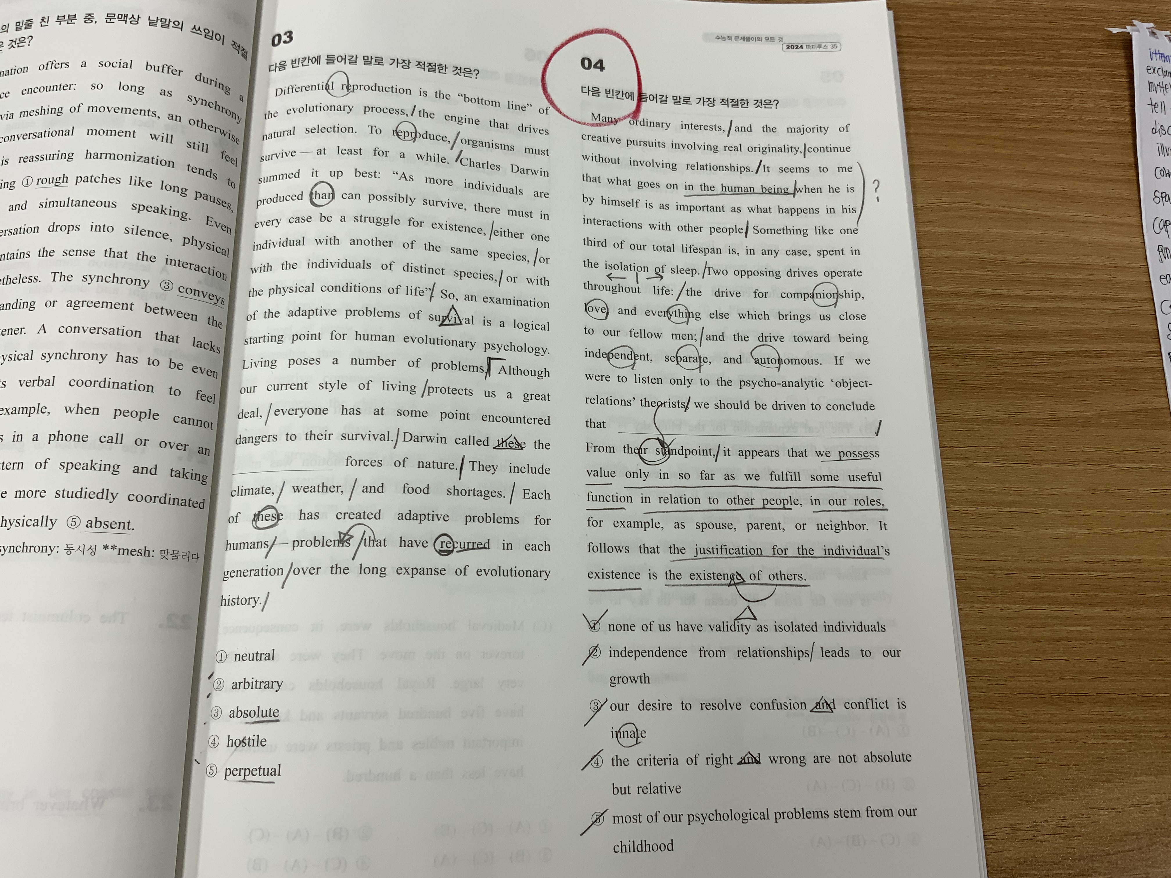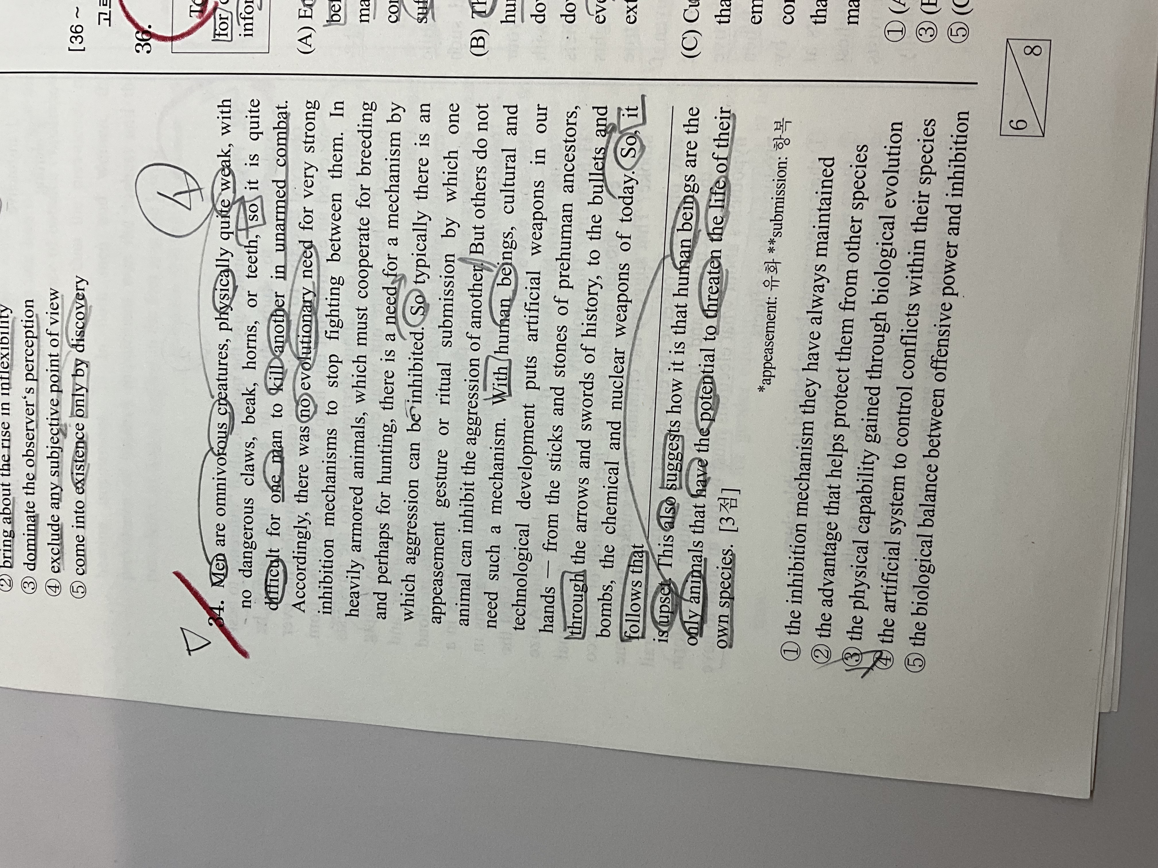 서바알파 14회 34번입니다. 마지막 문장에서 인간이 자신의 종의 생명을 위협할 잠재력을 가진 유일한 동물이라고 말하고 있으니 4번 선지의 종족 내 갈등을 통제하는 인공적인 시스템이 빈칸에 들어가야 한다고 생각했는데 4번 선지가 답이 안되는 이유와 5번 선지가 답인 이유를 잘 모르겠습니다.
