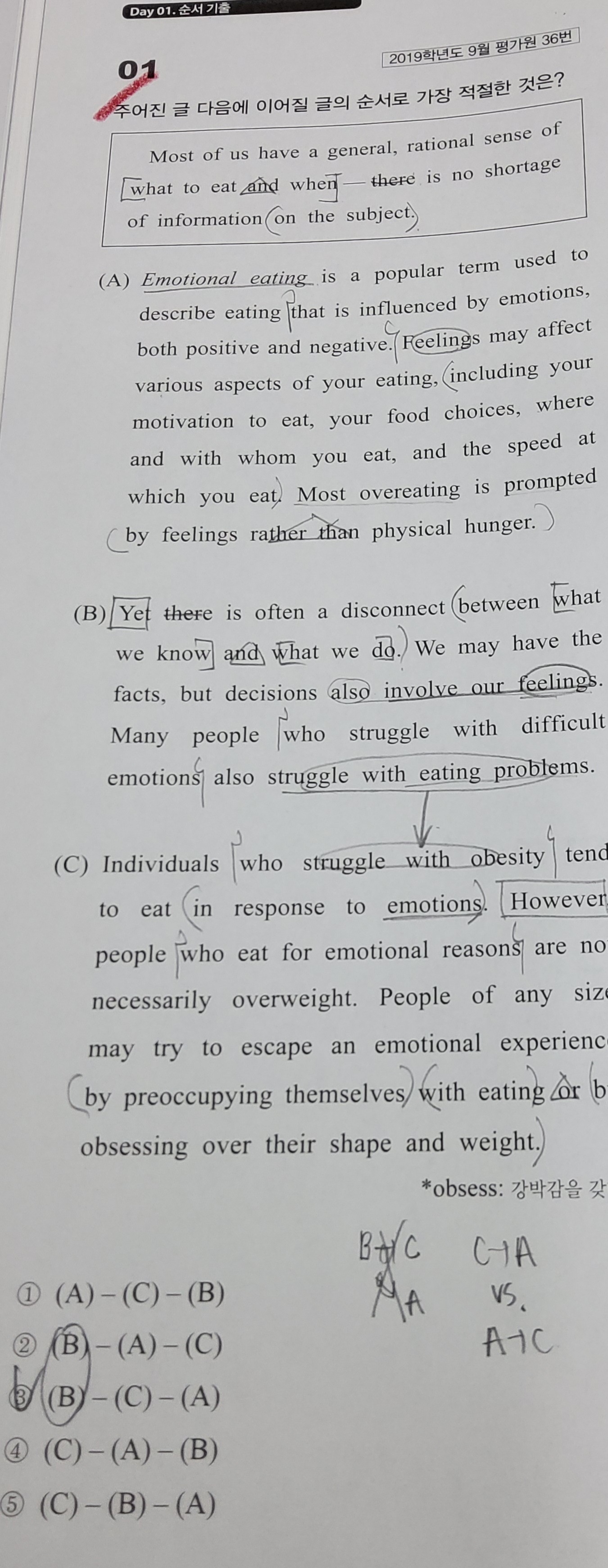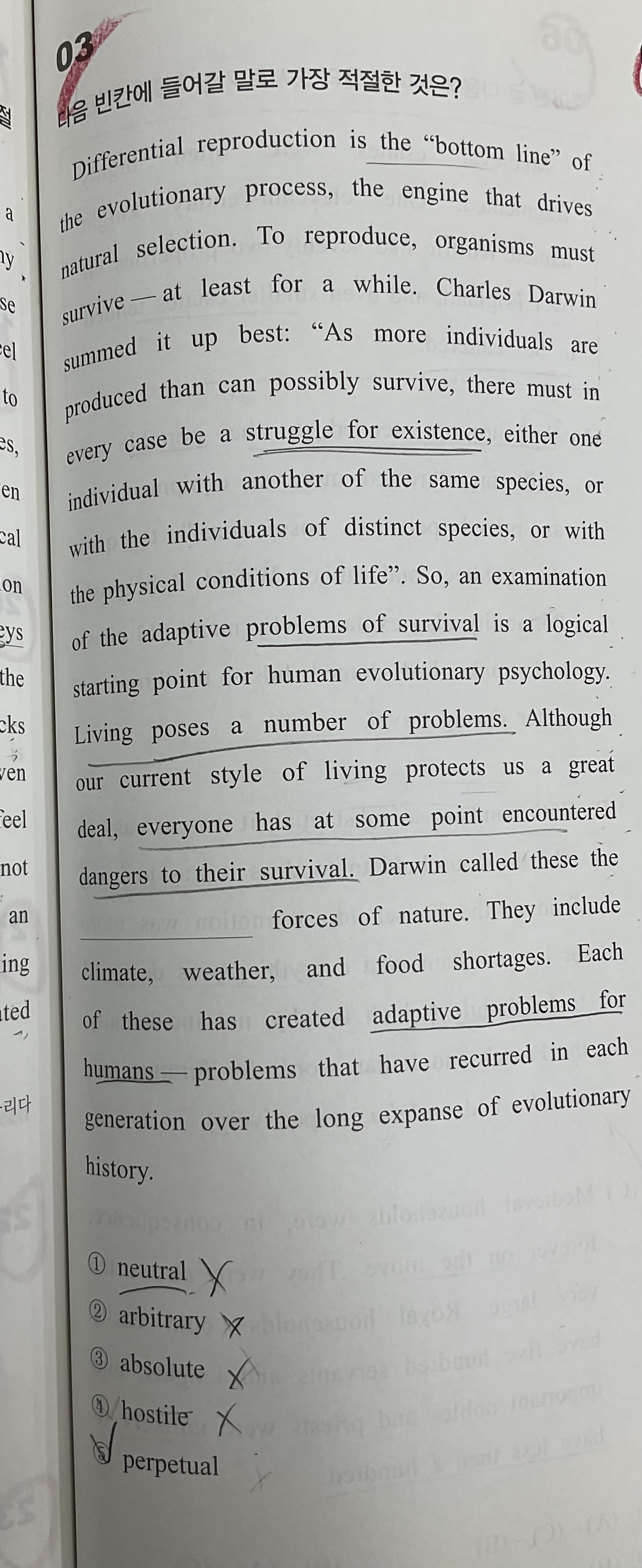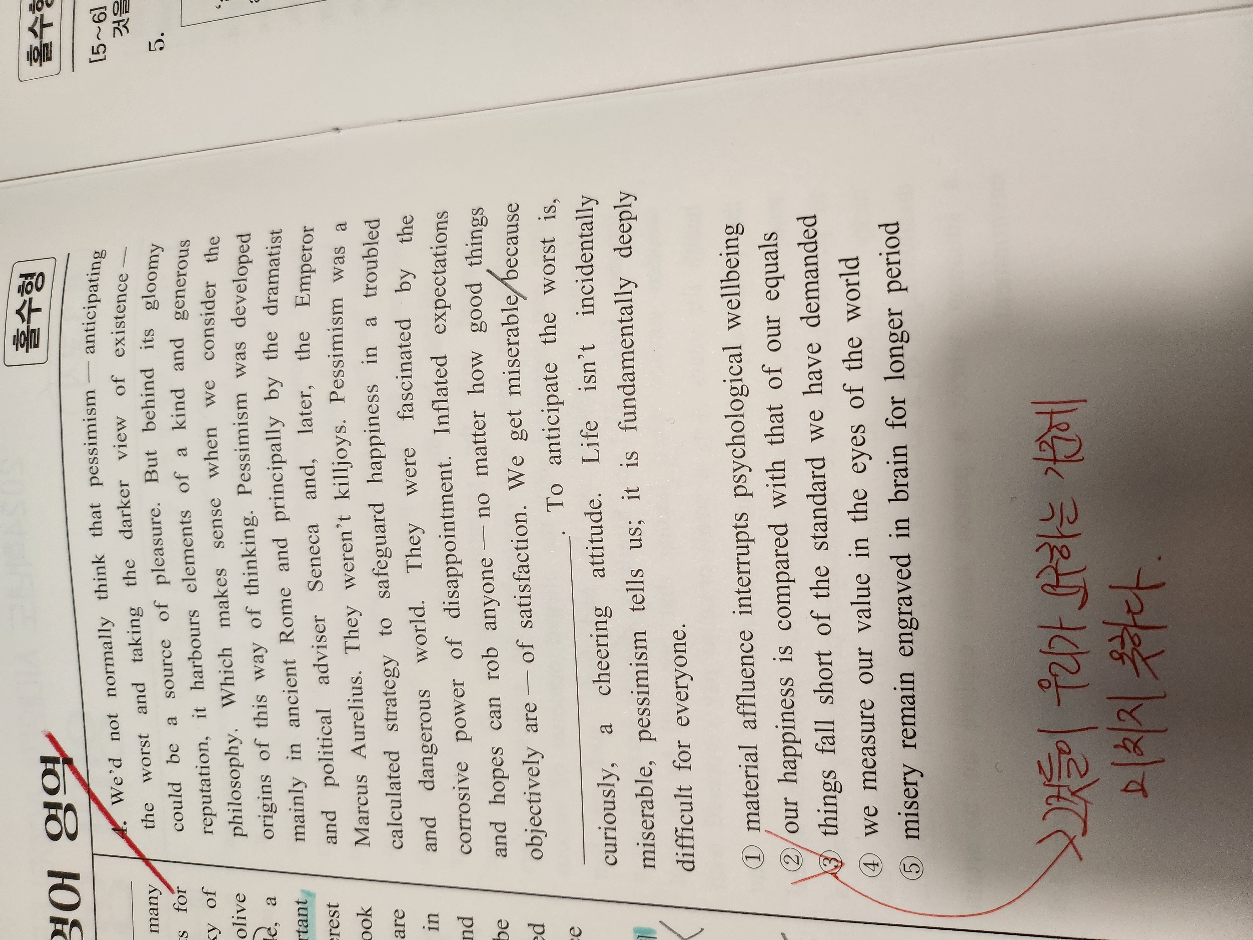 저는 빈칸 앞문장, '부풀려진 기대와 희망은 객관적으로 그것들이 좋을지라도 우리에게서 만족감을 빼앗을 수 있다.'와 지문 전반적인 흐름인 비관주의를 긍정하는 태도를 근거로 답을 찾으려고 했지만, 5개의 선지 중에 해당 내용과 관련있다고 판단되는 선지가 없었고 3번이 답이라는데 이해가 가지 않습니다.
