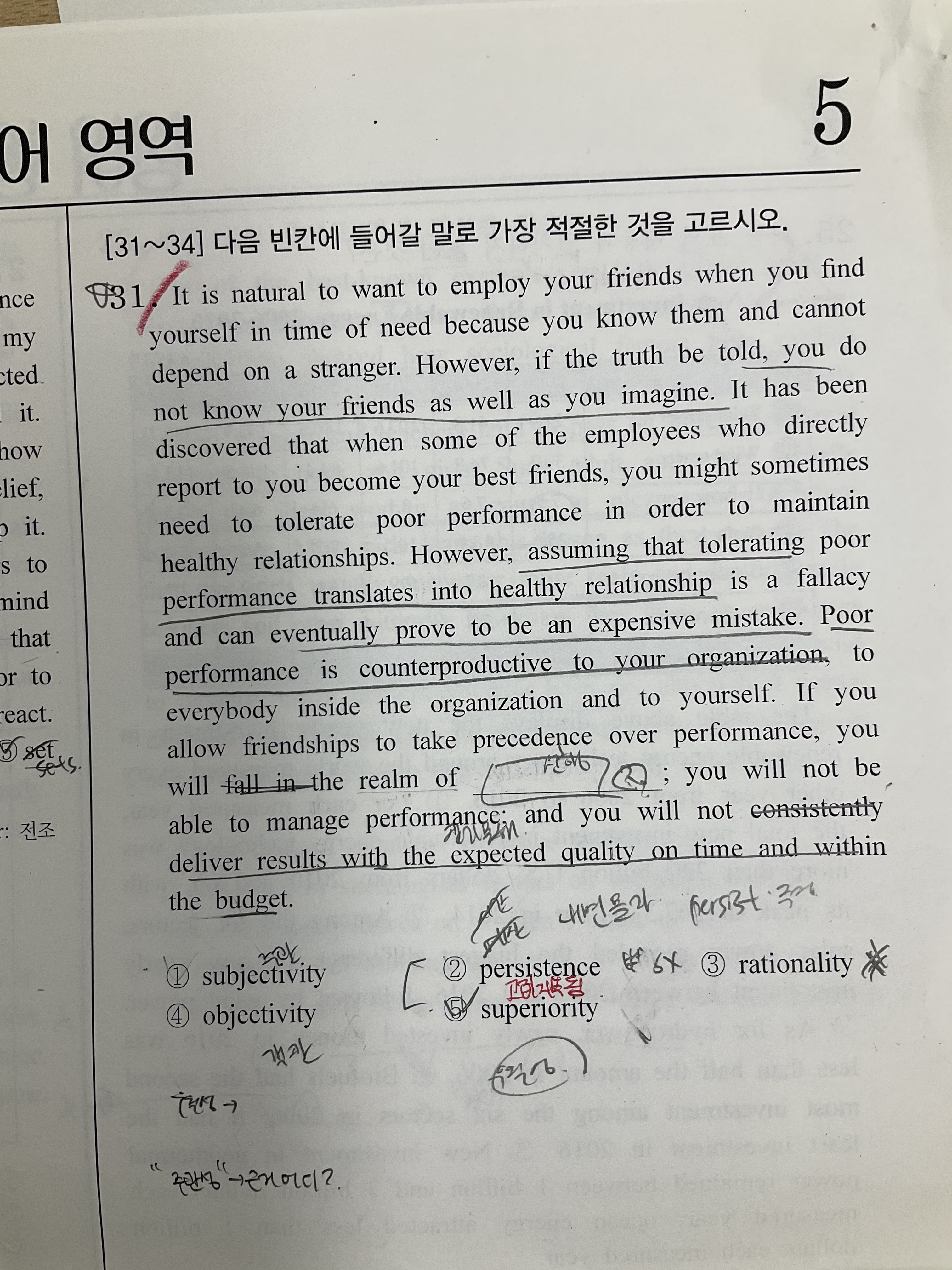 또한 제가 풀때는 5개 선지 모두 답이 될 수 없다고 판단하여 소거후 5번 선지인 우월성이 가장 답이 될 것이라고 생각해서 5번을 골랐는데