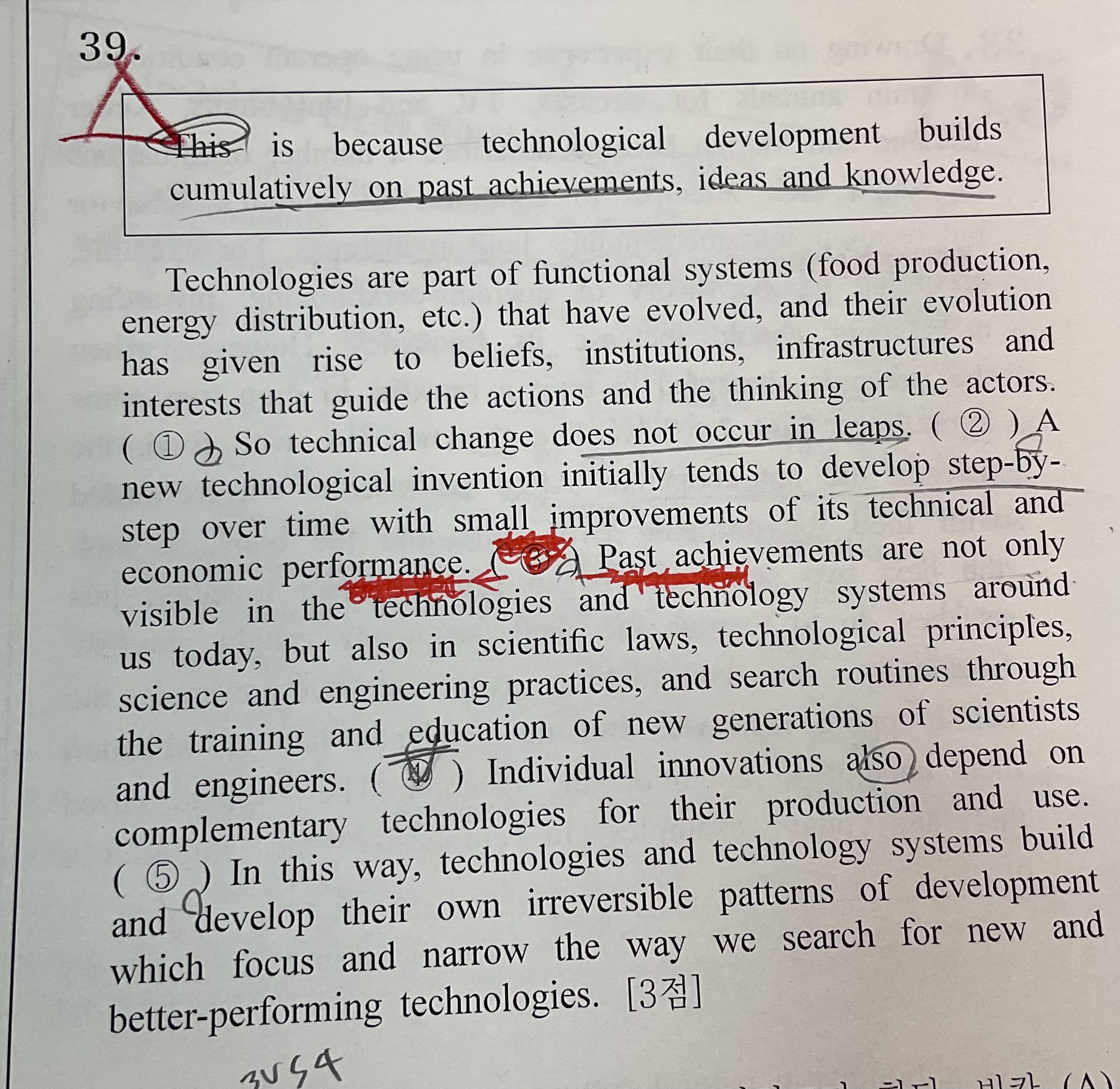 과거의 업적들이 오늘날 우리 주변에 있는 기술에서 보인다. 왜냐하면 기술적 발전은 과거 업적들로부터 축적되어 구축되기 때문이다 의 흐름으로 4번이 더 적절하지 않은가요?