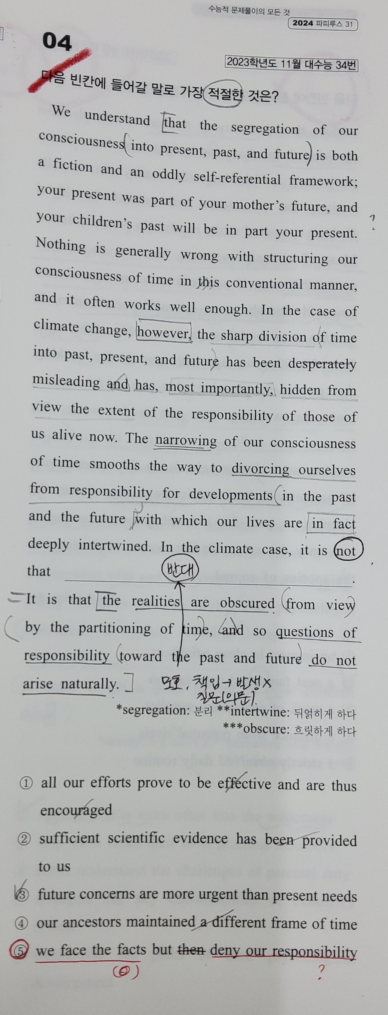 It is not 에서 부정어 not으로 인해 마지막 문장의 반대 내용이 들어가는 것은 파악했습니다. 그러나 5번 내용이 빈칸에 들어가야하는 이유를 잘 모르겠어요 ㅠㅠ 뒷 문장의 that 절의 내용과 반대되는 내용인 이유를 잘 모르겠습니다