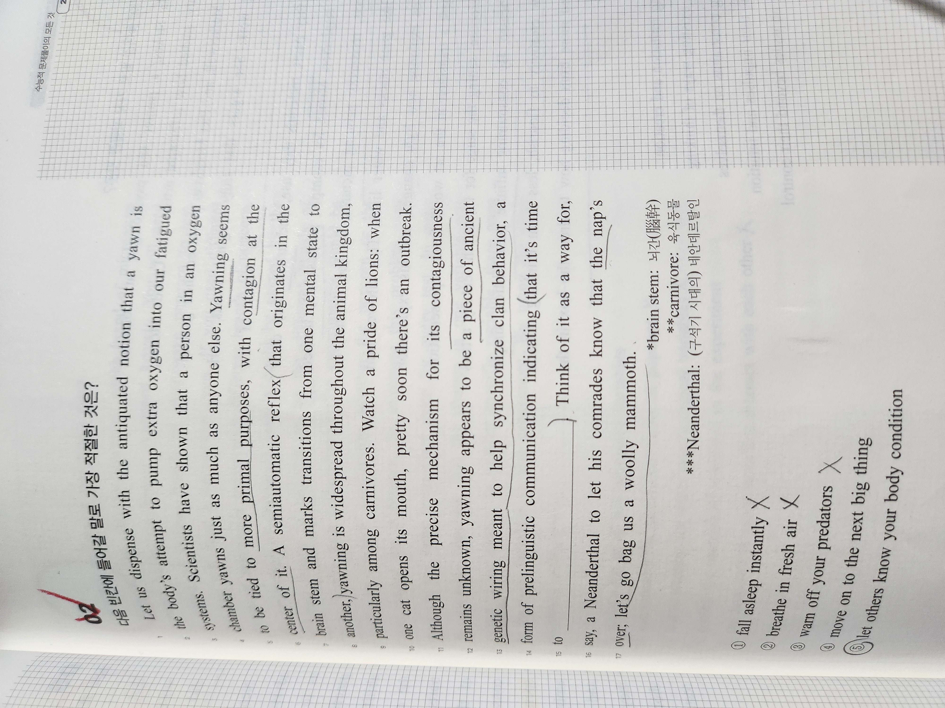 4번이 답이 되는 이유요 ! 사실 답이 없어서 5번 택하기는 했는데 하품이 전염성있다, 그래서 언어가 있기 전에 의사소통 수단으로 사용될 수 있다고 읽어서 그나마 5번이 소통의 의미가 이ㅛ다고 생각하여 선택했는데 안되나요 ? ㅠㅠㅠ