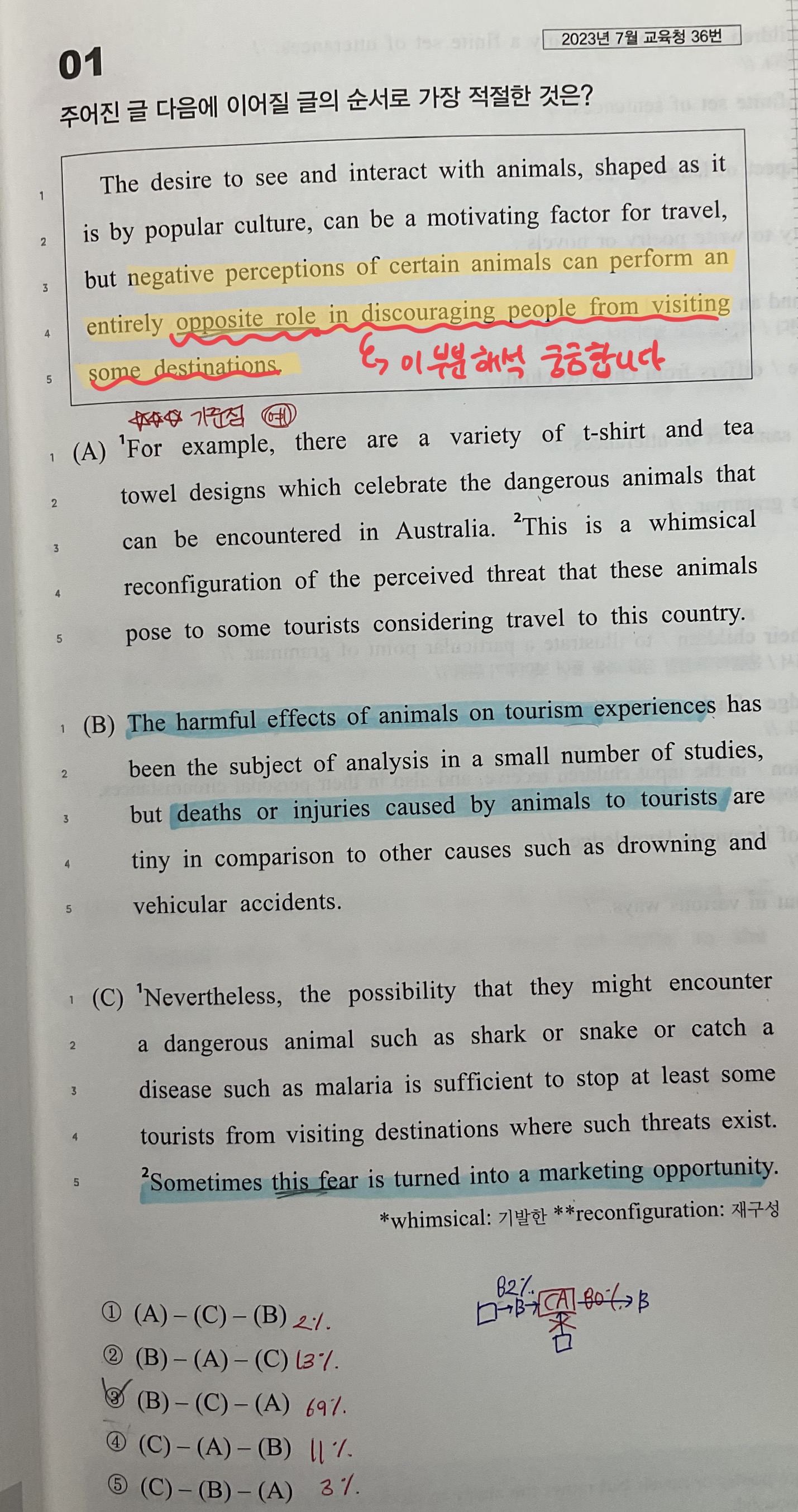 주어진 글의 끝부분에 negative perceptions of certain animals can perform an entirely opposite role in discouraging people from visiting some destinations 라는 표현이 나오는데 이 문제에서는 문맥상,