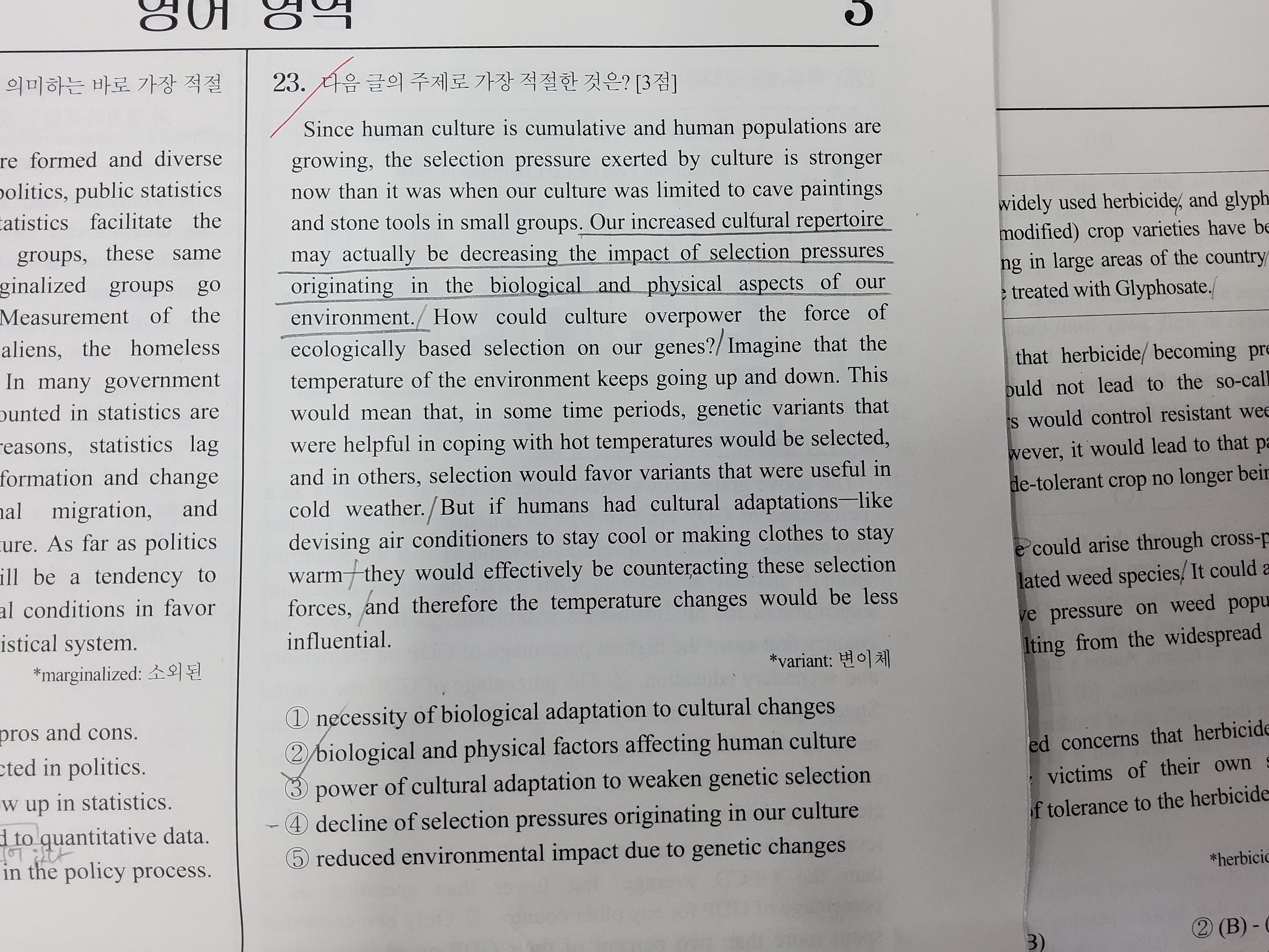 글 중간에 보면 우리의 증가된 문화 목록은 선택 압력의 영향을 감소시킬 수 있다고 나와 있고