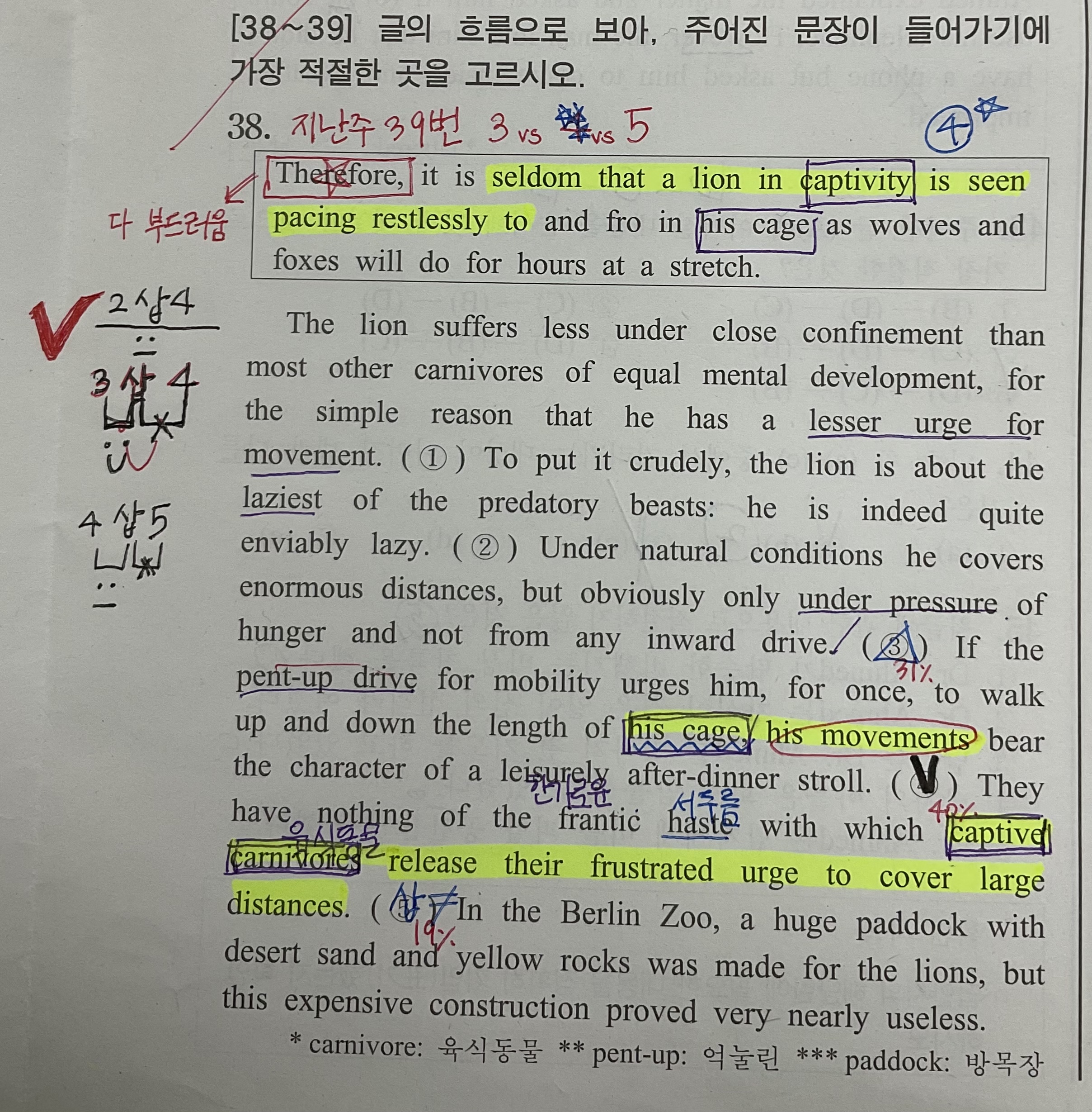 검색어를 ‘seldom that a lion in capacity is seen pacing restlessly' 와 ’his cage'로 해서 4번 문장이 나와서 2삽3은 고려도 안 했고 3삽4는 wolves and foxes를 carnivore로 재진술해줘서 매끄럽다고 느꼈고 4삽5는 삽5 흐름이 딱히 좋지는 않으나 45흐름과 다를 바가 없다고 생각해서 지우지 못했는데 어느 부분에서 4,5가 틀렸고 어떤 흐름으로 답을 찾아내야 하는 지 잘 모르겠어요ㅜ