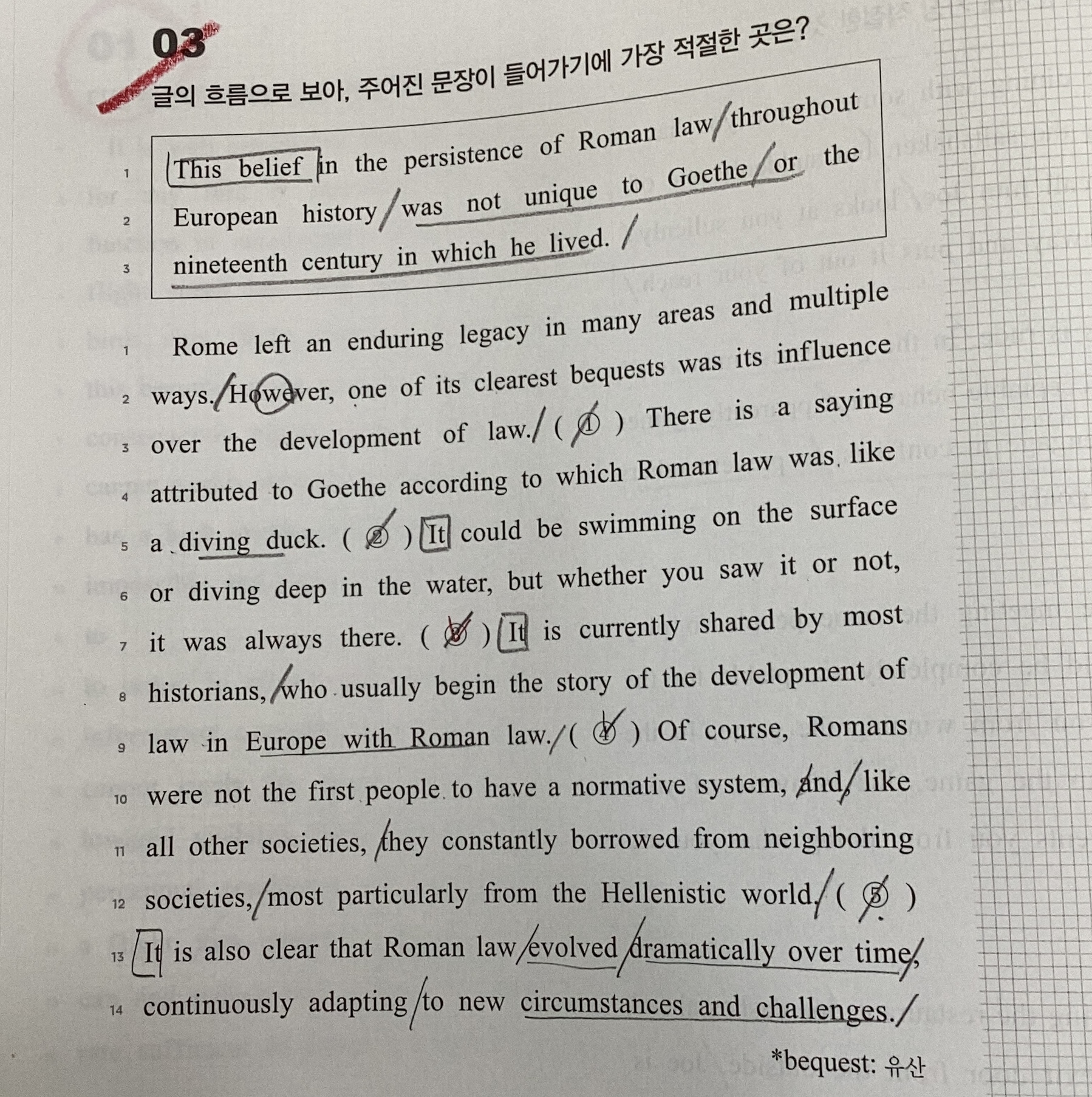 (4)번 문장 앞에 ‘Europe with Roman law’가 제시문의 ‘throughout European history’와 연결된다고 생각해서 답을 4번으로 골랐는데 (4)번이 안되는 이유 설명 부탁드립니다.
