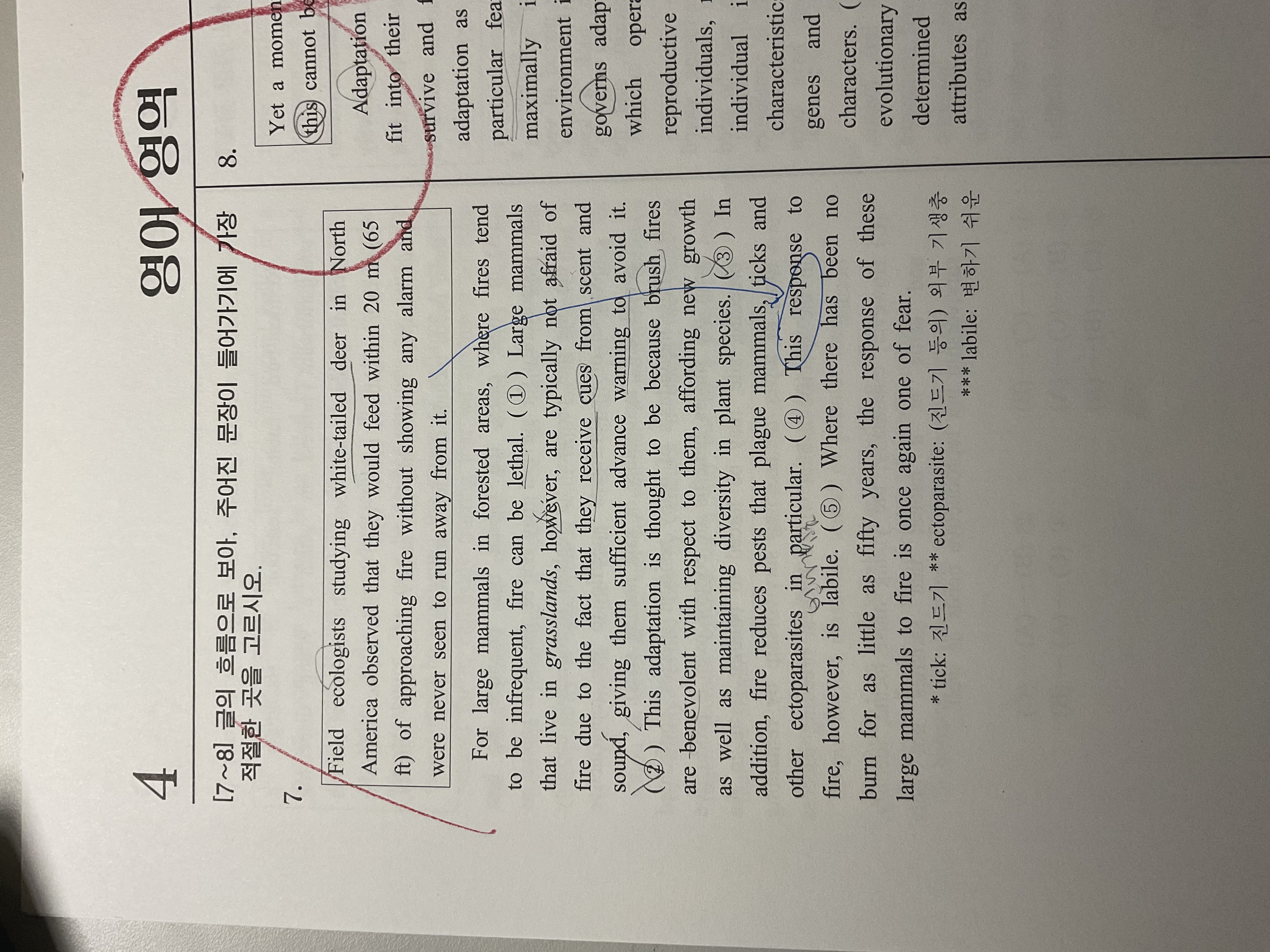 액셀러레이터 15권 7번문제 질문입니다. 2번 앞에 문장이 큰 포유동물들이 불을 두려워하지 않고 충분한 경고를 받았다고 언급되어있어 박스 문장 white tailed deer이 이에 대한 예시와 함께 앞문장과 비슷한 내용으로 좋은 흐름이라 판단해 답으로 골랐습니다. 어떤 부분에서 잘못 접근했나요?