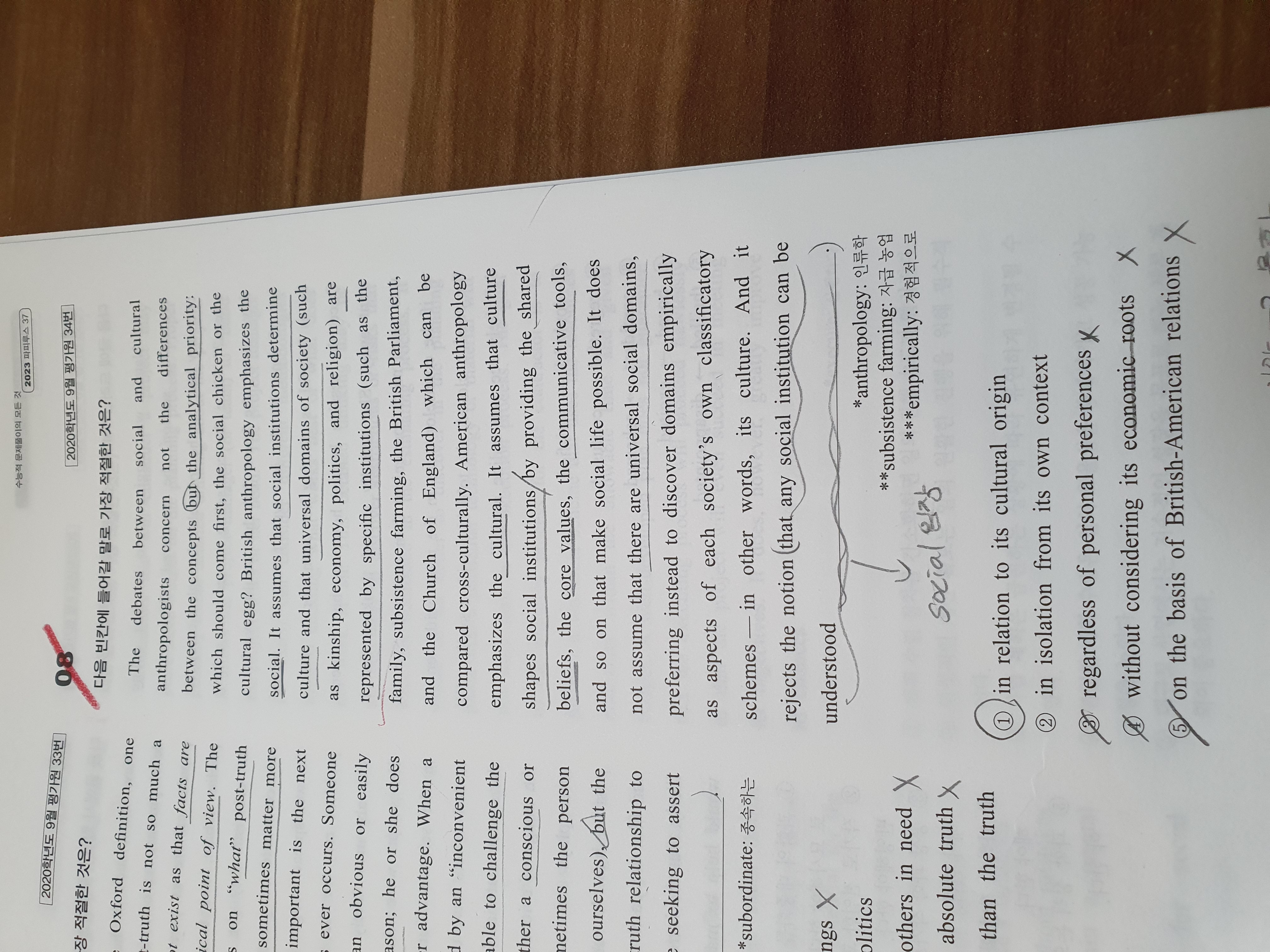 에서 빈칸에는 영국인류학자들이 주장한 내용이 들어가야 한다고 생각 했습니다. 그래서 기관 -> 문화 이러한 흐름을 잡았습니다.