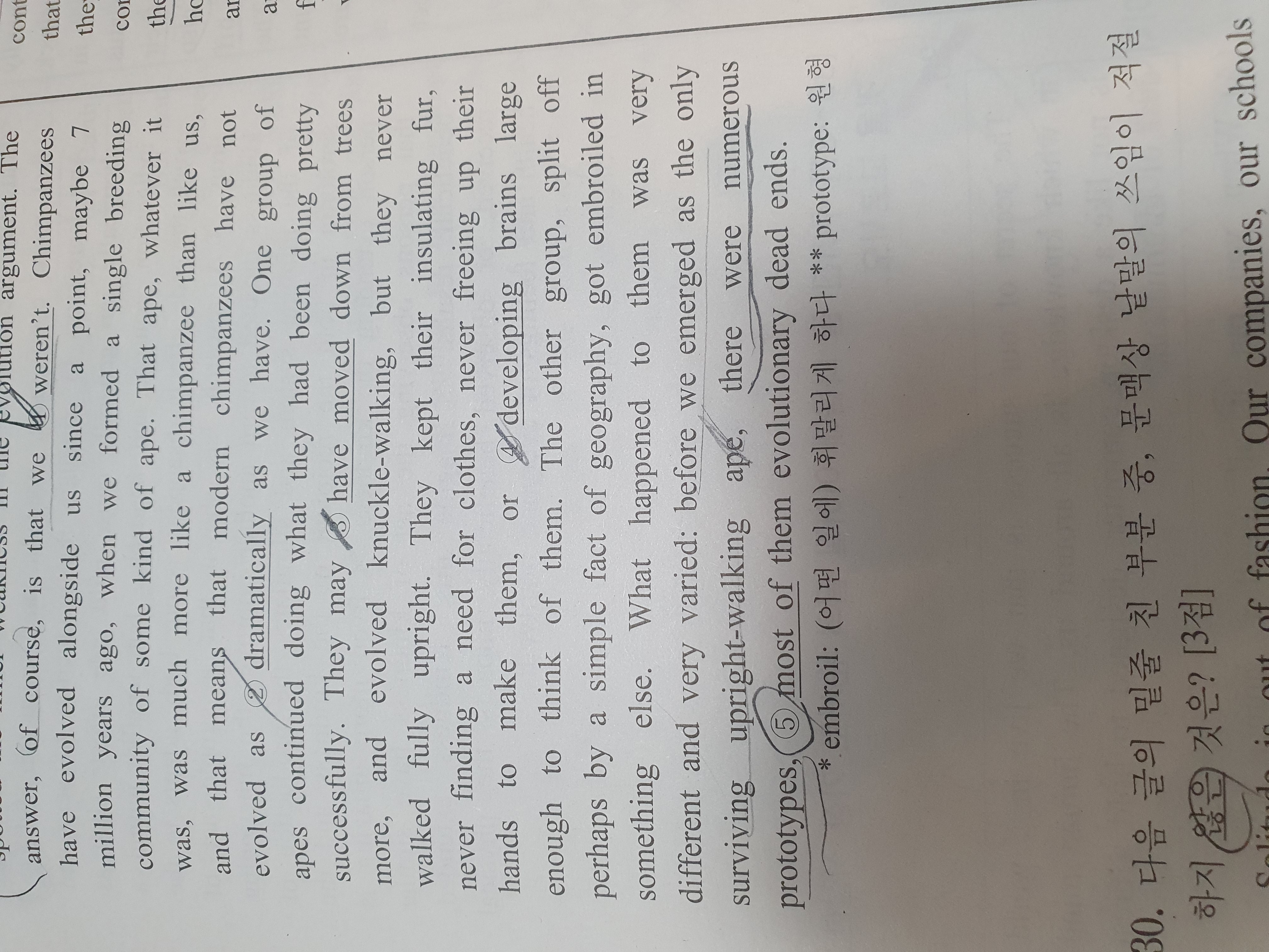 1번 선지 evolve from chimpanzees가 생략된 구조인걸 어떻게 아나요??