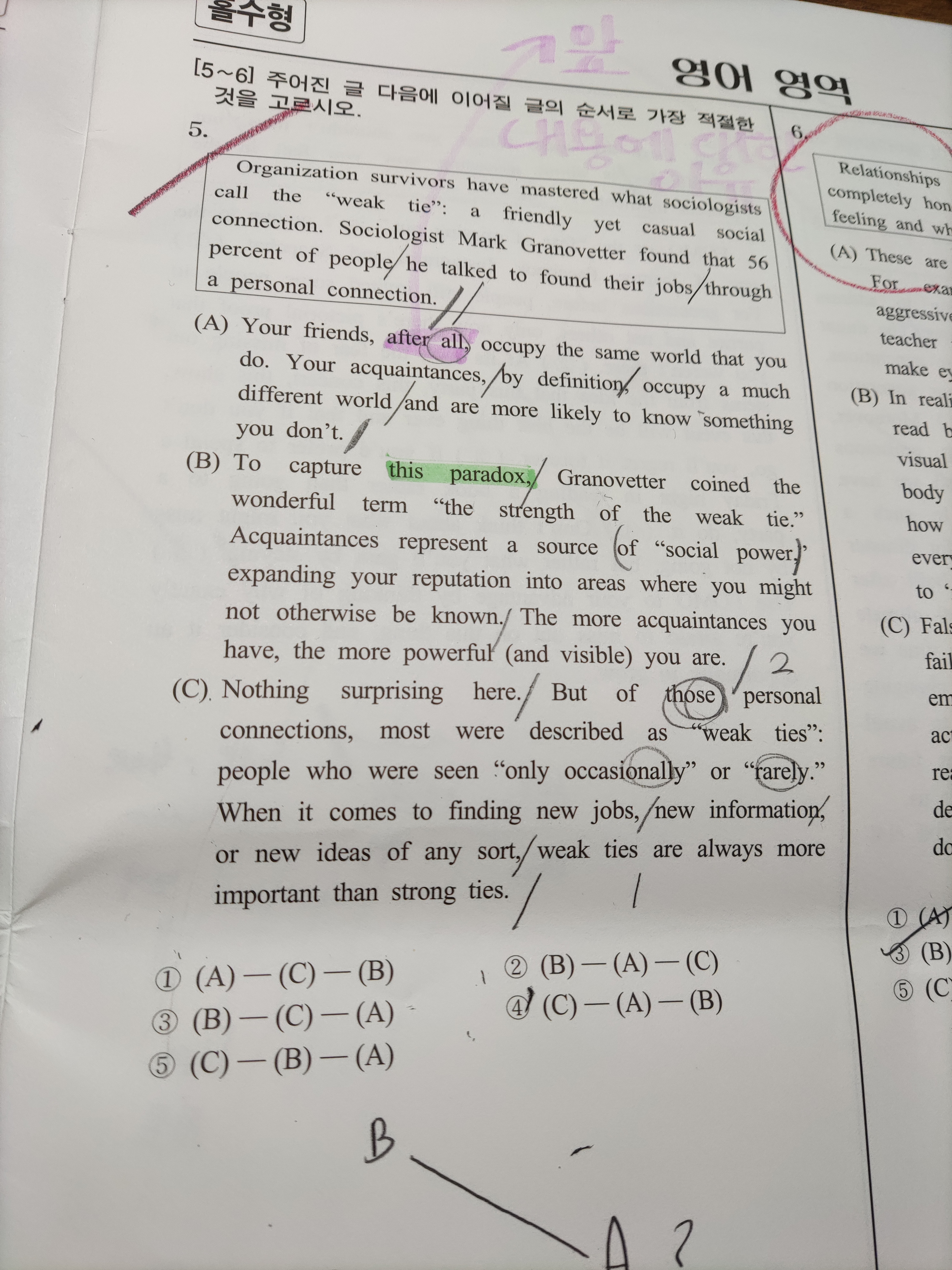 3번 질문 : this question을 바로 앞문장과 연결하려는데 정답인 c b순서로는 앞앞 문장으로 밖에 설명이 안되는 건가요? 선생님께서 앞문장만 보라 하셨는데 좀더 유도리 있게 가야하는 건가요?