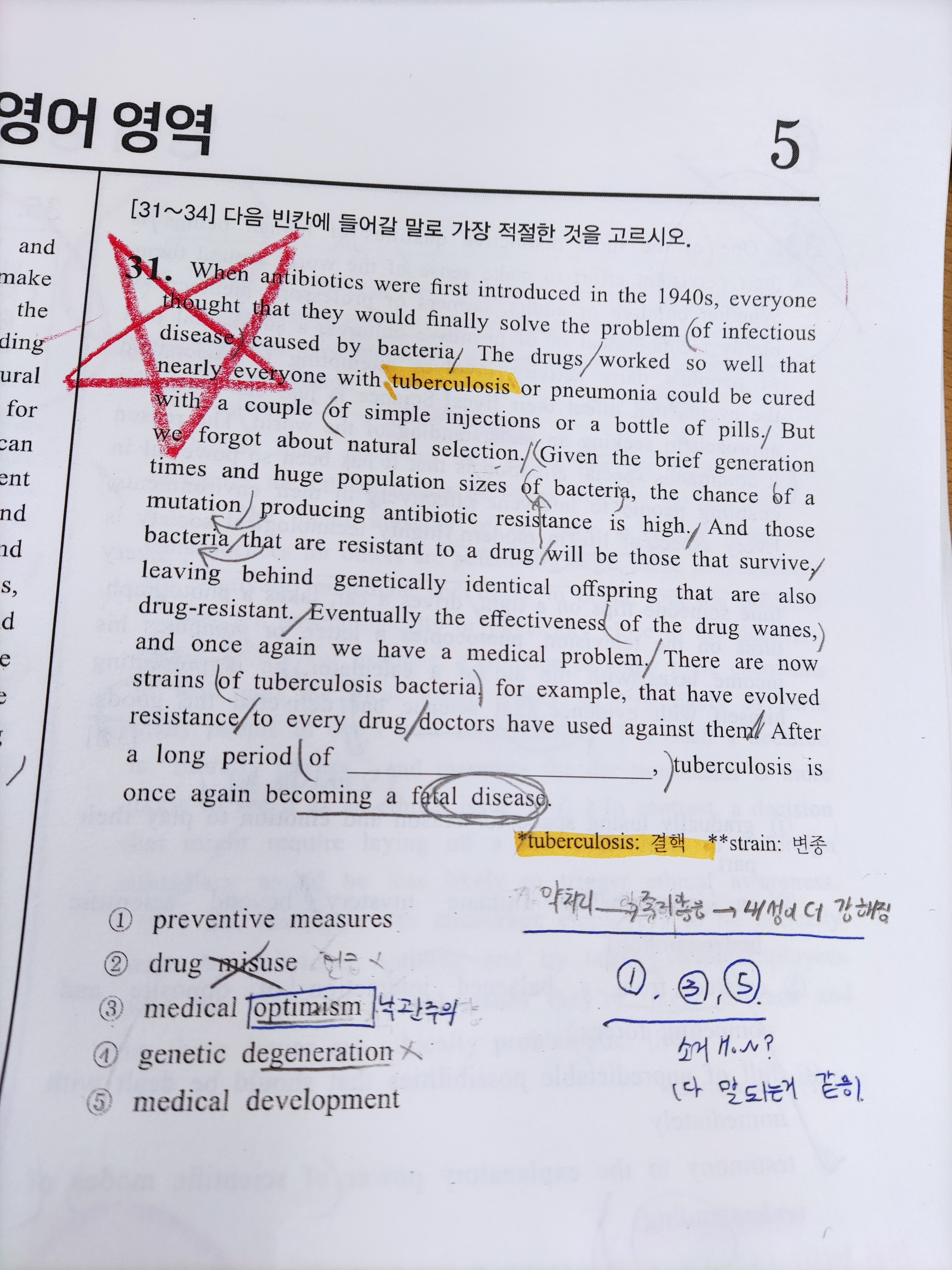 약의 내성에 관한 얘기인것은 알겠는데 1,3,5번이 다 넣어보면 맞는 거 같습니다. 수업시간에 배운대로 답이 아닌 선지는 소거해주세요