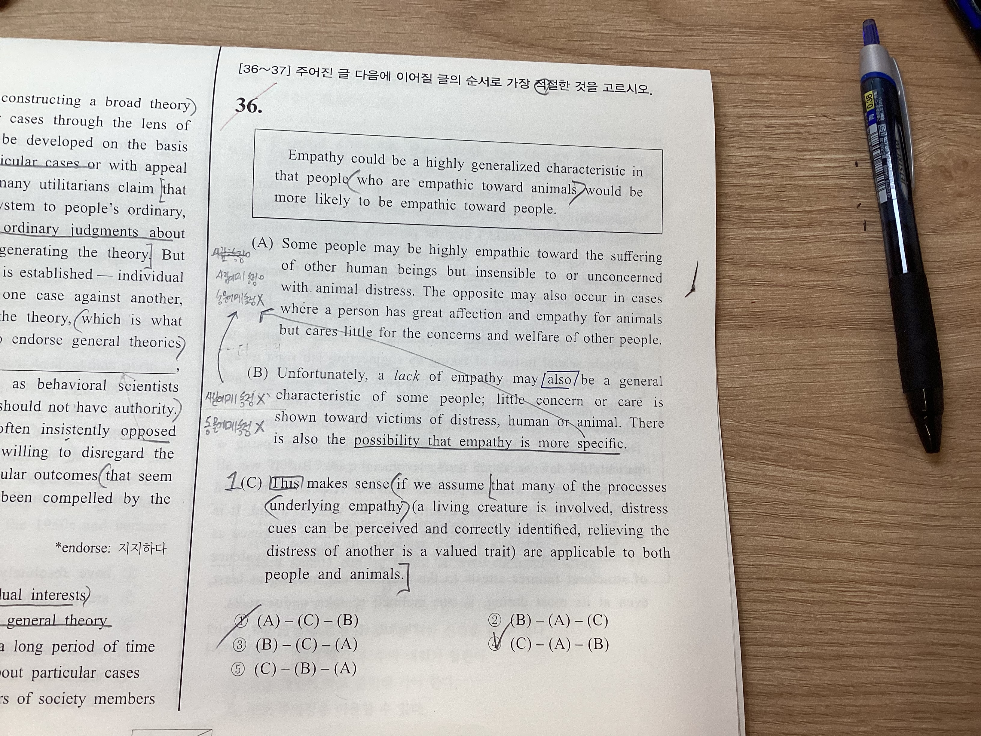 선생님 아무리 생각해봐도 2번 선택할때 B의 내용은 필기한대로 사람에게 동정x,동물에게 동정x이고 A의 내용은 사람에게 동정O,동물에게 동정X로 B의 마지막문장인 동정은 더 구체적일 가능성이 있다를 A의 내용이 그대로 받기에 B-A 로 판단하는건 시험장에서 할 수가 없을 것 같습니다.