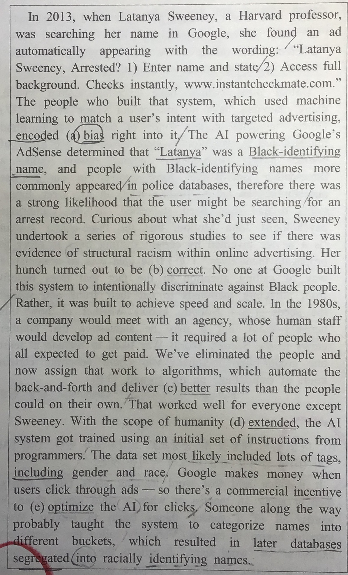 저는 b앞뒤에 있는 그녀의 예감이 구조적인 인종차별이라고 보고 뒷문장에서 구글은 의도적으로 흑인에 대한 차별을 만들지 않았다를 바탕으로 그녀의 예감은 틀렸으니까 2번이 정답하고 넘어갔습니다. 물론 손가락 걸고 넘어가서 정답인 4번을 넘어가서 틀린게 잘못이기는 하지만 2번이 답이 안되는 이유가 궁금합니다.