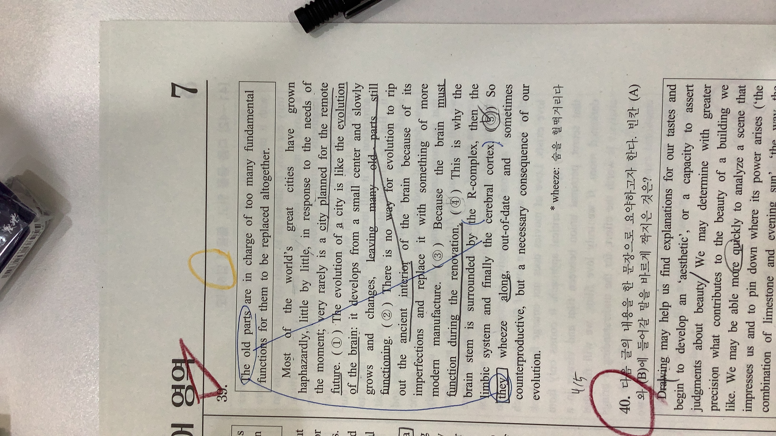 저는 문풀 당시 오래된 부분들이 수리를 하는동안 기능을 해야하고 많은 기본적 기능들을 담당하며 한거번에 교체될 수 없기 때문에 뇌가 R-complex,limbic system,cerebral cortex 순서로 축차적 구성을 이룬다고 생각해서 4번문장에 This가 주어진 문장을 받고 5번 문장의 they가 R-complex,limbic system,cerebral cortex 를 받는다고 생각했는데요 ㅠㅠ