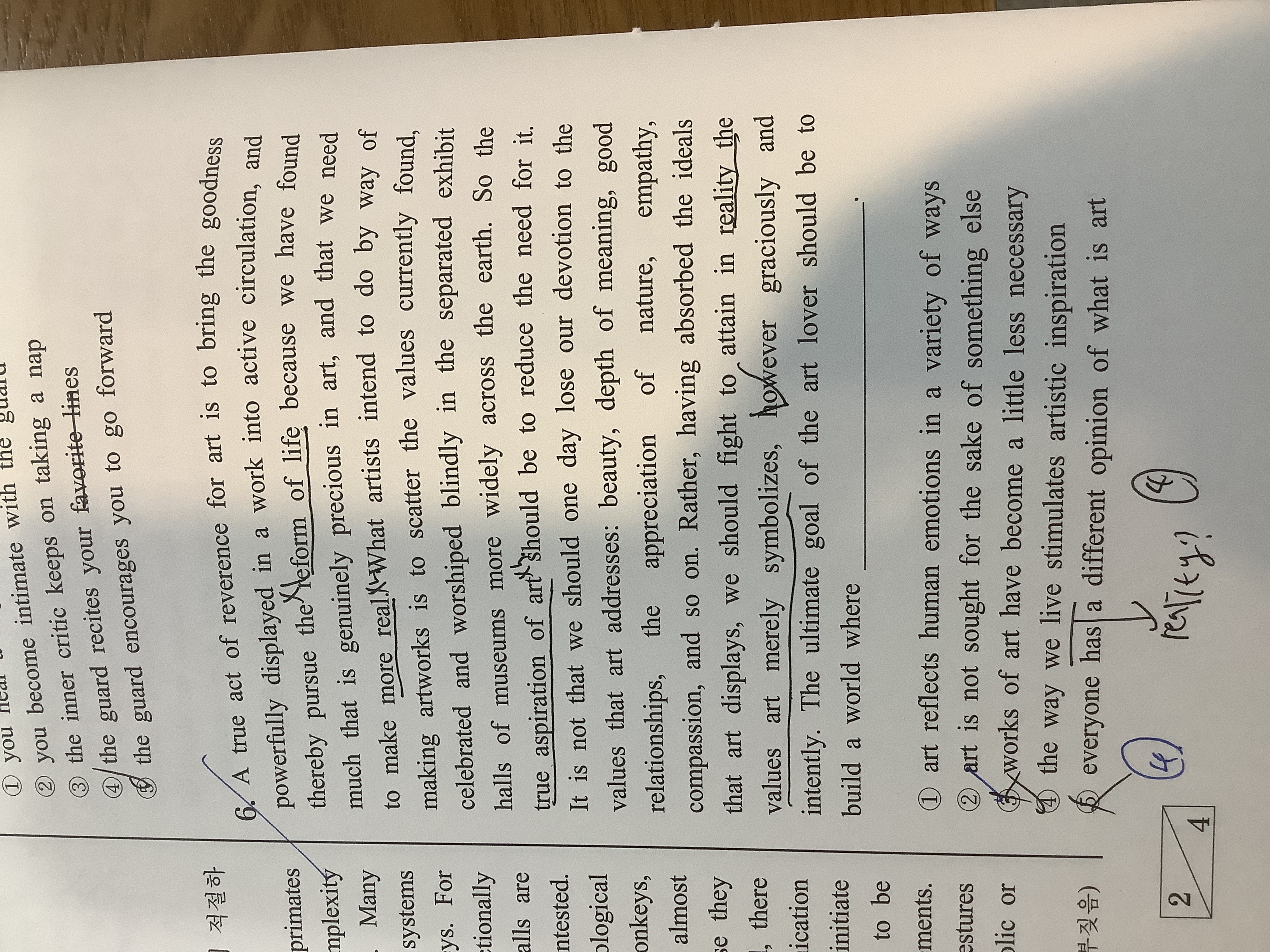 빈칸의 방향성은 앞에서 reality 에 대한 내용이 반복됐던거같아 미술의 사실성..?? 이쪽으로 잡았고, 4번 선택지에서 we live가 reality야? 하고 4번 찍었는데 어디가 잘못된걸까요??