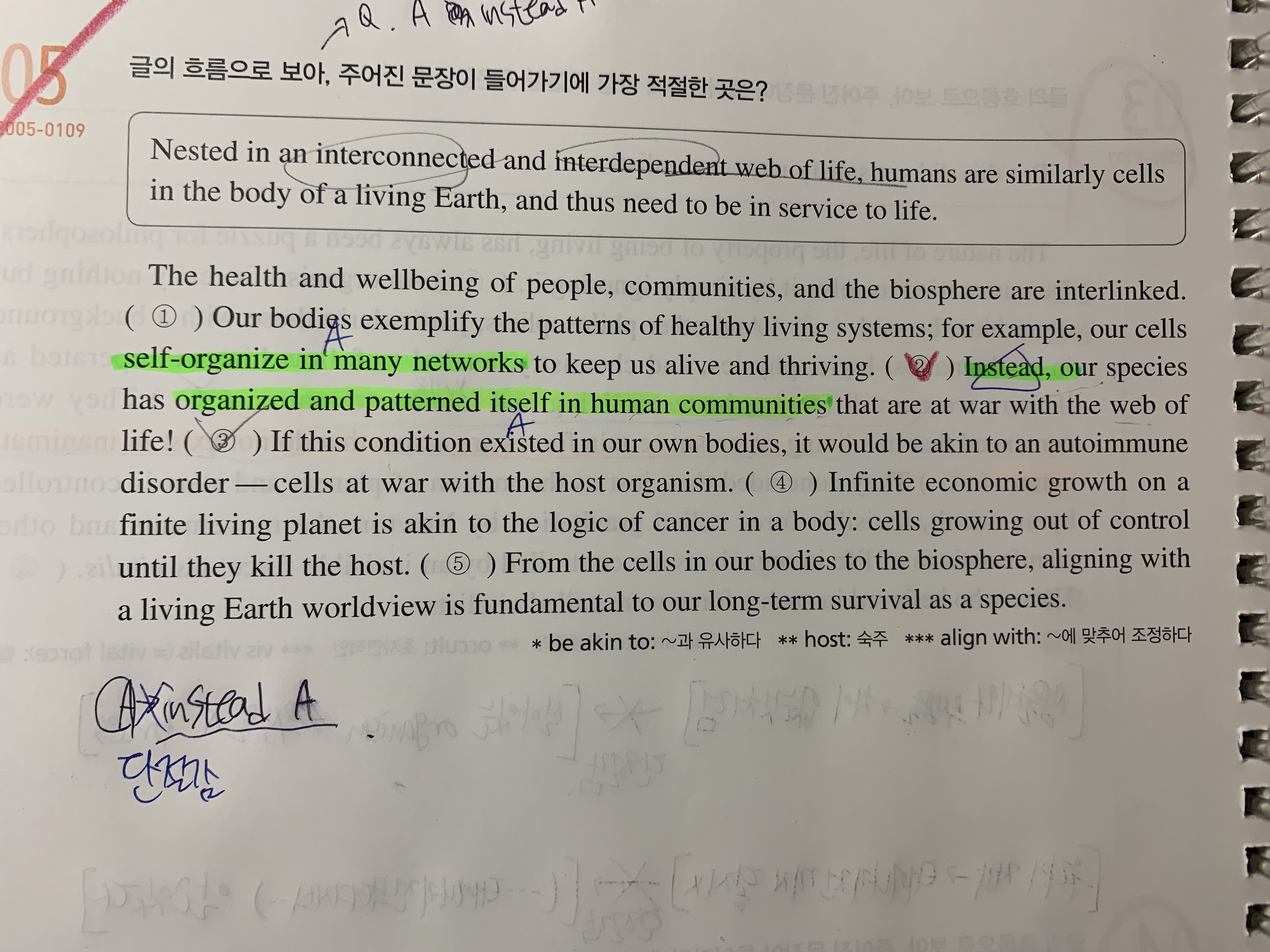 선생님이 강의 중 여전히 4번문장의 해석이 완벽하지 않지만( 무슨 얘기 하는지는 모르겠지만) 4번문장과 5번문장이 같은 내용이 아님은 알겠다 그래서 단절감을 찾았다 라고 하셨는데