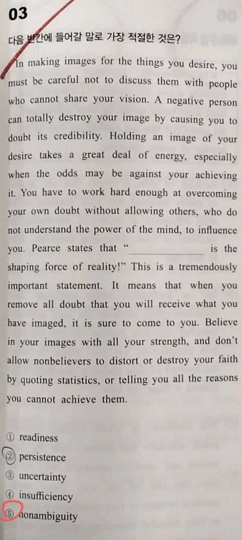 저는 '오히려 남의 말에 흔들리면 안되고 스스로 확실이 있어야 한다' 라는 내용에 주목하여 persistence를 골랐거든요