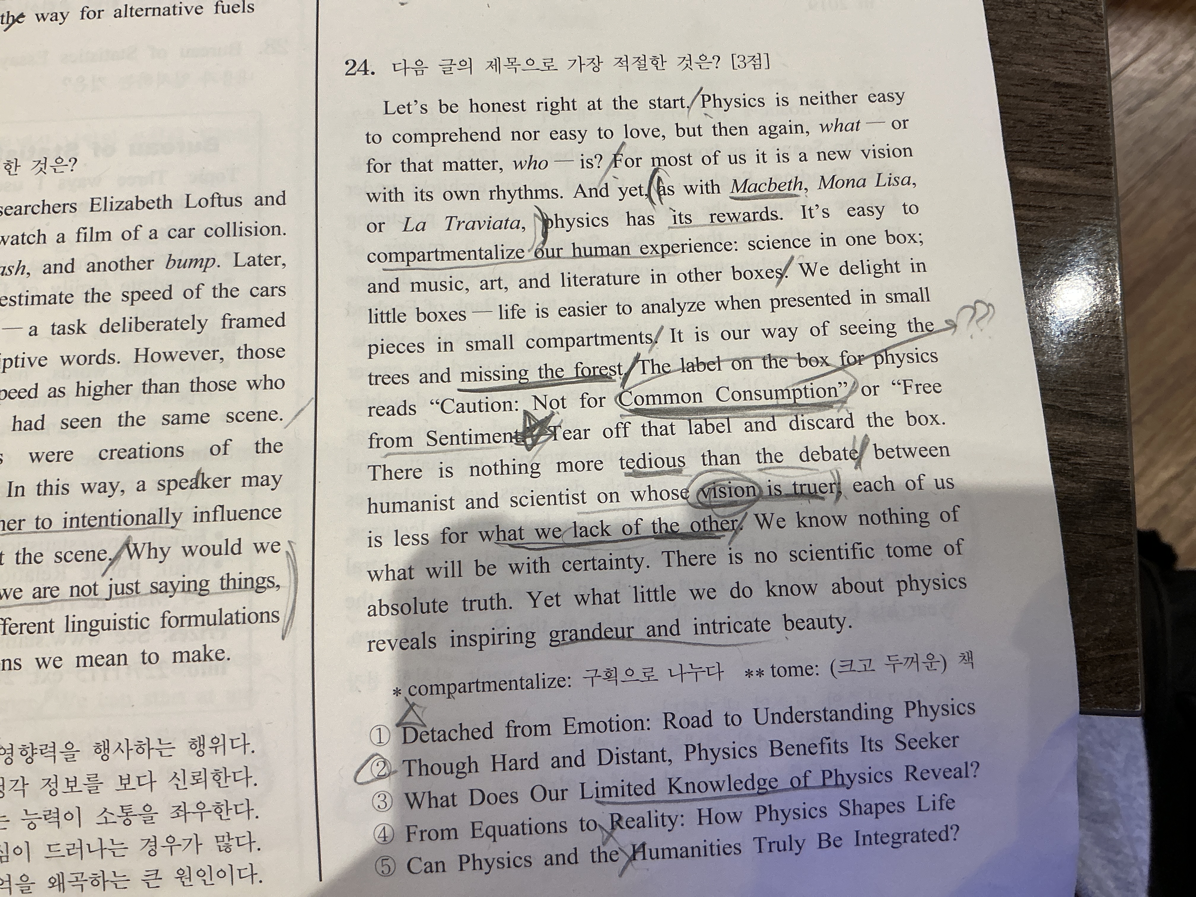24번 지문에서 '물리학은 보상을 가지고 있다, 물리학의 상자에 붙른 라벨(무감성, 일반적 소비를 위한 것이 아님)을 뜯어내라' 에 대해서 쭉 이야기 하다가